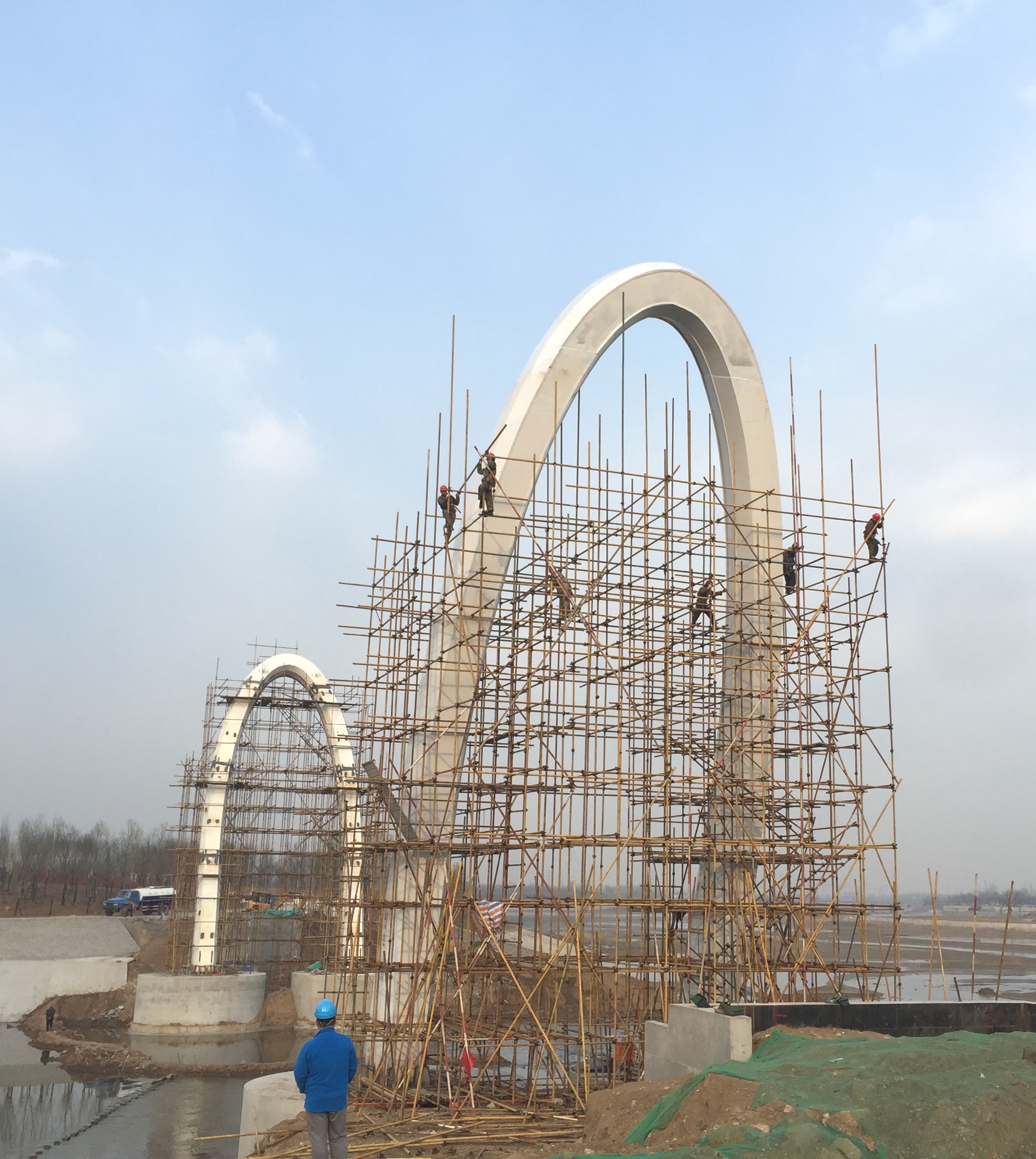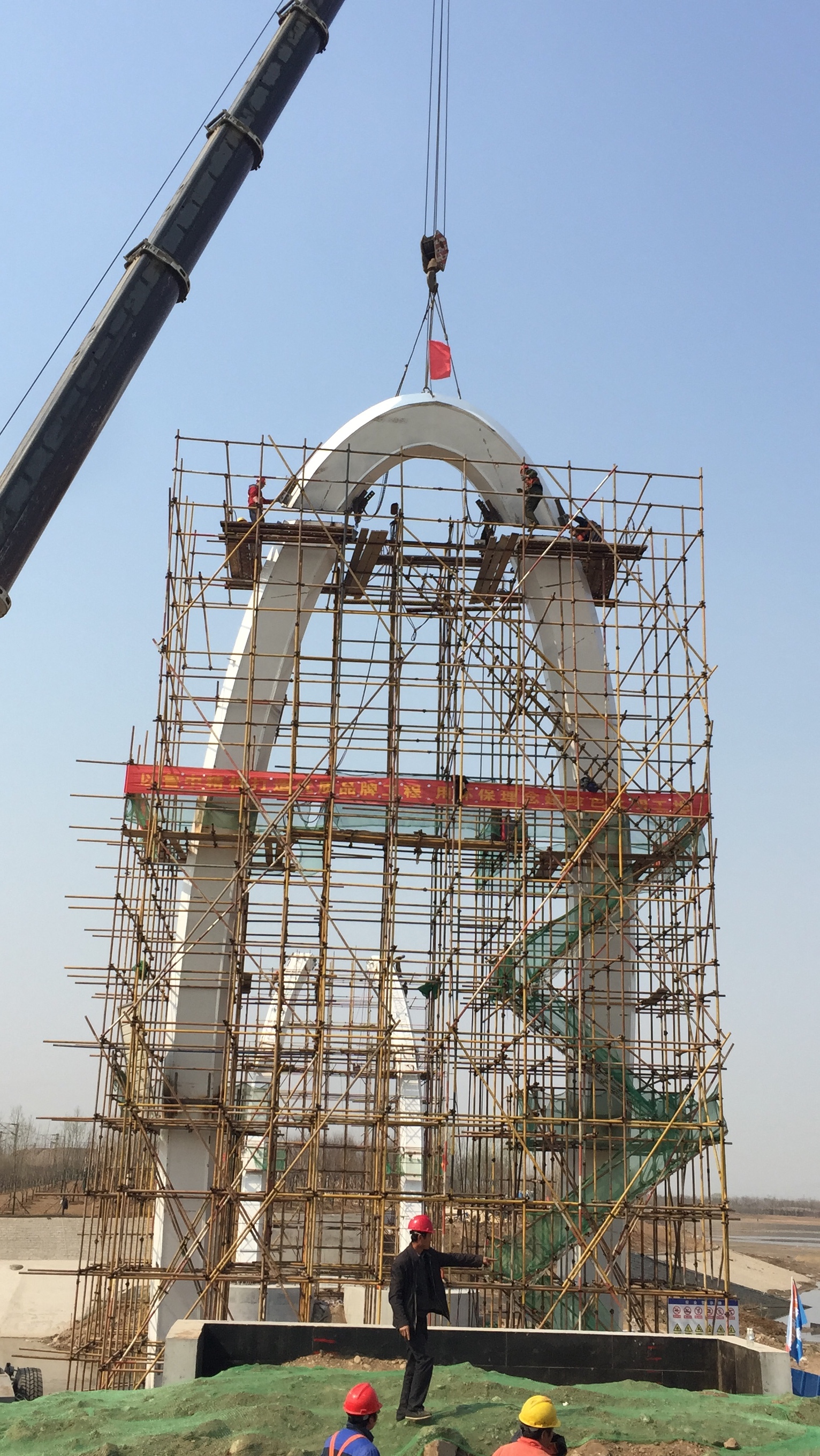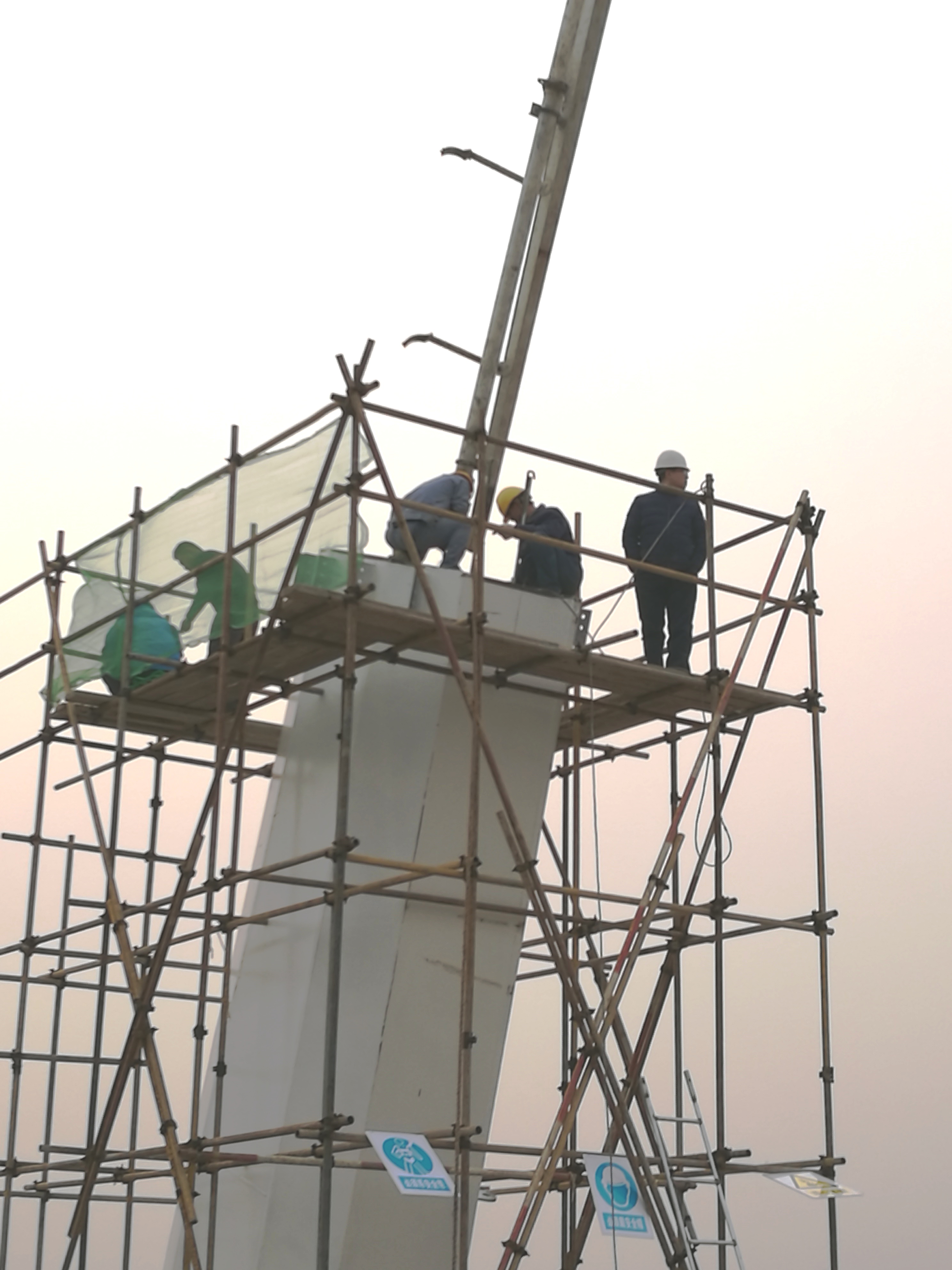 2017年2月28日,鋼主塔施工搭設(shè)腳手架。