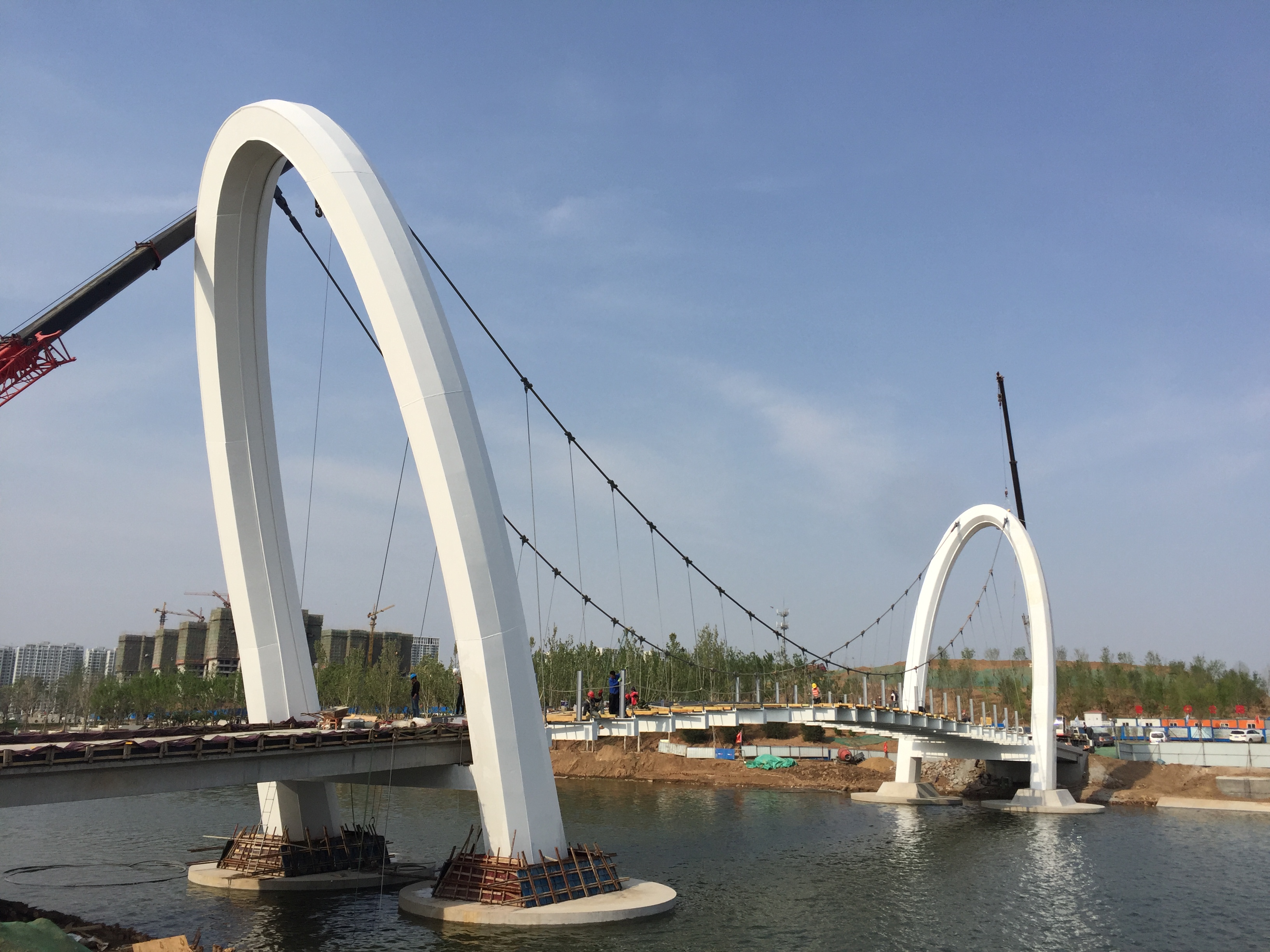 美麗的孝婦河濕地公園內(nèi)矗立著一座雄偉的白色懸索橋,它緊鄰膠濟(jì)鐵路客貨雙線橋,橫跨孝婦河?xùn)|西兩岸,遠(yuǎn)遠(yuǎn)望去猶如一條鋼鐵巨龍?jiān)陉柟庀蚂陟谏x。陽光下,碧波蕩漾,懸索橋意氣風(fēng)發(fā)盤踞在水波之中;夜空中,星輝閃耀,懸索橋潔白如玉與銀河相互輝映。這就是由我山東魯中公路建設(shè)有限公司所承建的淄博市第一座鋼結(jié)構(gòu)懸索橋。
