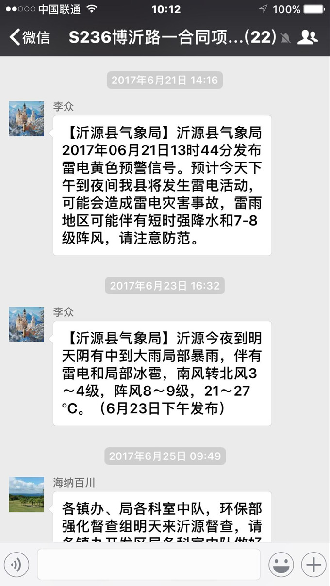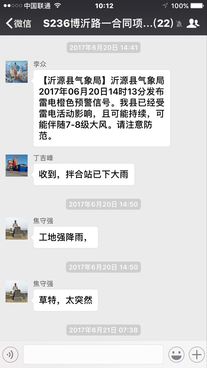 項目部負責人每天保持對天氣預報的收聽,對發(fā)生或者可能發(fā)生的突發(fā)防汛事件,及時通報,讓大家防患于未然,在出現(xiàn)緊急情況時能快速協(xié)助各施工隊做好恢復生產(chǎn)工作。