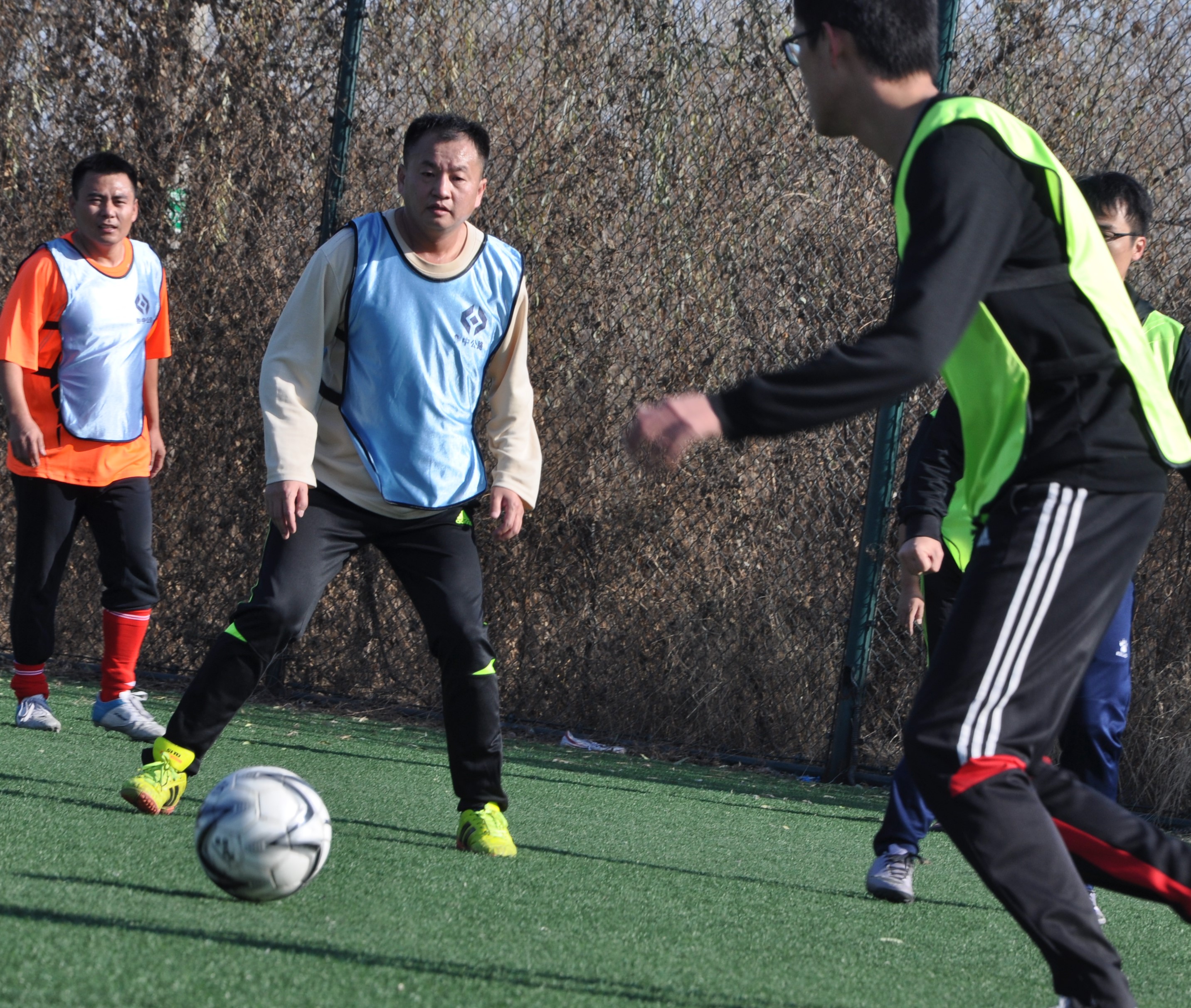 賽場上,隊員們激烈拼搶,盡情發(fā)揮球技,搶斷、過人、射門、撲救……精彩場面一個接一個,大家你追我趕,奮力馳騁。冬日的暖陽灑滿整個綠茵場,賽場上的人們熱情激昂,場下的觀眾也是心情激蕩。賽場周圍被染了金黃的楊柳樹,也仿佛重新煥發(fā)了生機,隨著風的律動,左右搖擺,歡呼雀躍。