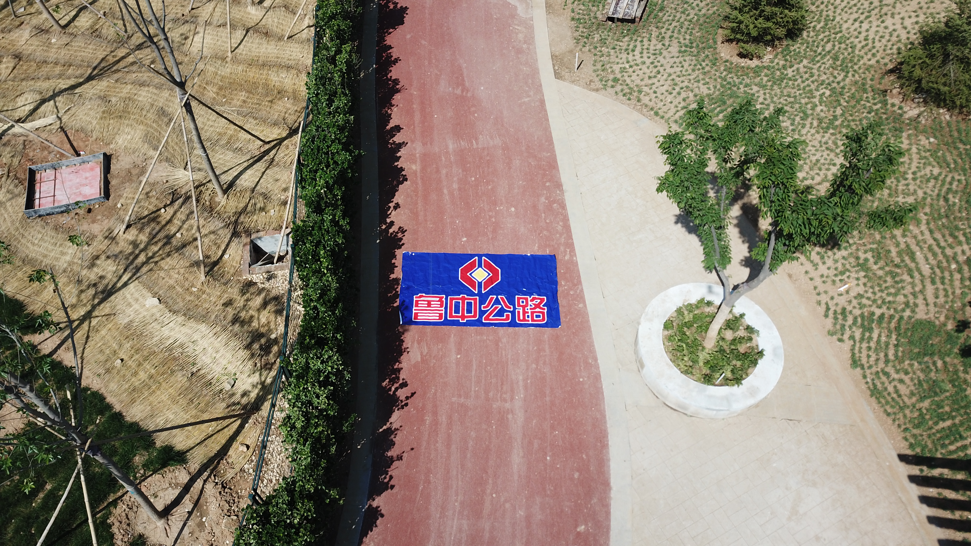 2018年5月1日,市政工程分公司開始了文昌湖東岸彩色瀝青道路施工,此為市政分公司第一條彩色瀝青施工項目,意義重大。當天一早,我們便攜無人機到達施工現(xiàn)場,升空后,文昌湖碧波蕩漾,金沙灘光彩奪目。料車到場后,徐徐移動的攤鋪機、緊跟其后的壓路機,都形成了藍天下最美麗的畫卷,我們將提前做好的印有“魯中公路”的噴繪緊緊貼在攤鋪機頂棚上,巨大的LOGO在陽光的照射下熠熠生輝,就像極了我們魯中公路蓬勃發(fā)展的未來。