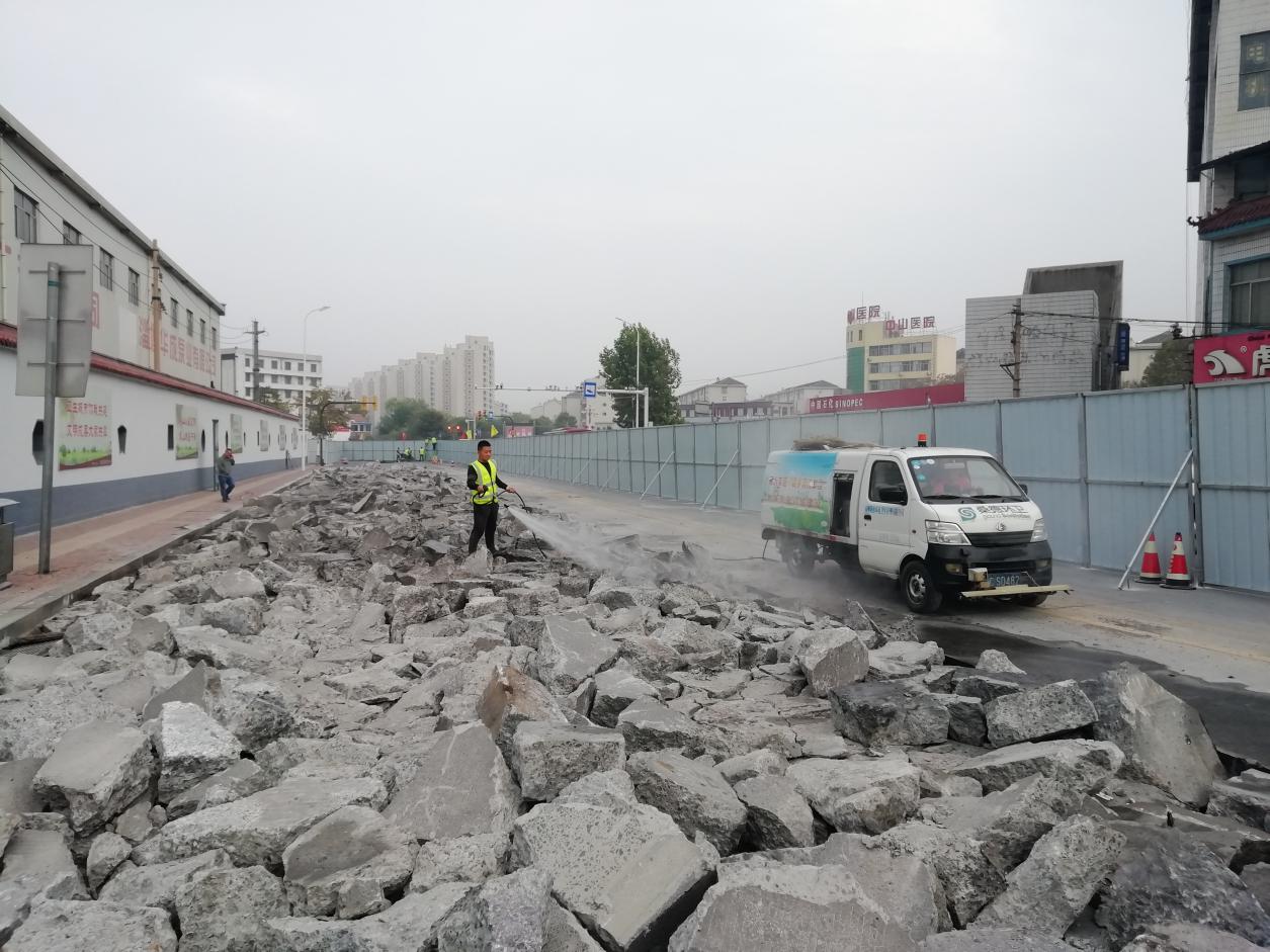 為了能趕在交通早高峰之前完成圍擋和封路,施工隊(duì)長(zhǎng)張棟皓帶領(lǐng)施工人員凌晨就趕到了施工現(xiàn)場(chǎng)進(jìn)行施工。此次封路采取的是半幅封路半幅開通的方式,為的也是能把施工對(duì)道路暢通的影響降到最低。為防止揚(yáng)塵,破除混凝土之前以及混凝土塊外運(yùn)的過(guò)程中安排了灑水車。