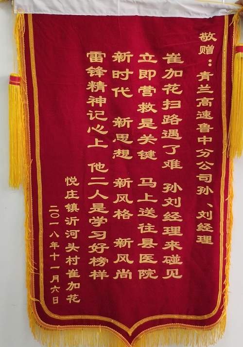 事后為了表示感謝,養(yǎng)護員崔加花及家屬一同到青蘭高速公路小修保養(yǎng)項目部給項目人員贈送了錦旗,崔家花激動地說:“魯中真是一個溫暖的大家庭,希望等身體好了以后再跟大家一起奮斗。