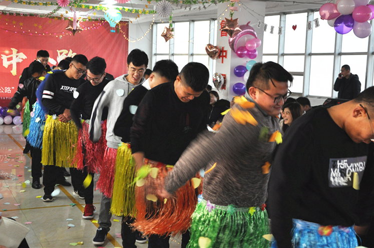一個(gè)個(gè)游戲下來(lái),聰明能干、呆萌踏實(shí)的小伙子們已經(jīng)打動(dòng)了姑娘們的芳心,但魯中公路小伙子的身上不僅僅只有這些亮點(diǎn),還有幽默、豁達(dá)、鮮活的另一面。隨著主持人的指令,手掌互動(dòng)的小游戲選出了需要被懲罰的人。小伙子們主動(dòng)請(qǐng)纓替女生受罰,身著草裙的他們開(kāi)始“舞動(dòng)人生”。婀娜的舞姿、妖嬈的步伐引來(lái)全場(chǎng)的陣陣笑聲,把整個(gè)會(huì)場(chǎng)氣氛推向高潮。