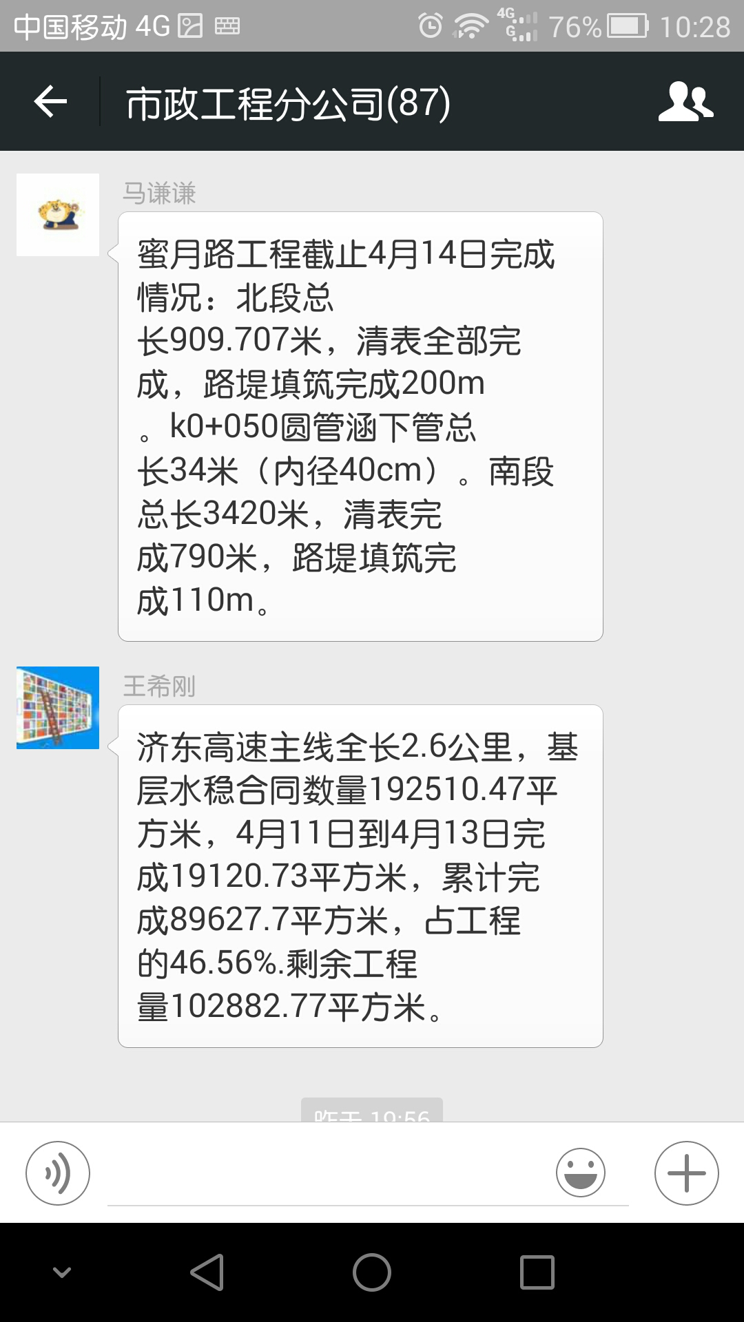 市政工程分公司于近期通過微信這一網(wǎng)絡(luò)社交app搭建了我們自己的工程信息實時分享平臺。成立分公司后,在分公司領(lǐng)導(dǎo)授意下,原淄川拌合站微信群擴大為市政工程分公司信息群,隨著各個工地工程的陸續(xù)展開,各種工程信息、進展動態(tài)源源不斷的推送至這一平臺,打開界面,總能看到領(lǐng)導(dǎo)們伸出大拇指的點贊和諸如“注意安全,抓好質(zhì)量”之類的耳提面命,我想這就為奮戰(zhàn)在一線的同仁們送去了一股暖流,也有同事們發(fā)來的施工照片、視頻、技術(shù)資料、實時數(shù)據(jù),這都為日后的發(fā)展積累了經(jīng)驗、儲備了技術(shù)。另一方面,微信平臺也是我們轉(zhuǎn)變思想、改革宣傳方法的一項舉措,我們主張有工作就要有宣傳,宣傳材料作為工作成果上傳,讓大家了解自身崗位、了解自身光輝。通過這種形式,大大提升了員工參與工作的積極性,工作效率明顯提高。