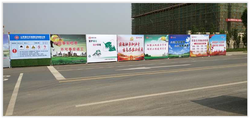 近年來(lái)山東省政府在建筑市場(chǎng)大搞生產(chǎn)安全、環(huán)境環(huán)保治理活動(dòng),淄博經(jīng)開區(qū)建設(shè)局要求在地面和空中都不能看到工地有揚(yáng)塵產(chǎn)生,建筑生產(chǎn)環(huán)境必須符合整齊、安全、環(huán)保的要求。魯中公路淄博經(jīng)開區(qū)道路工程項(xiàng)目,及時(shí)采取有效措施,既符合政府新標(biāo)準(zhǔn)又突出山東魯中公路文化建設(shè)的主線,適時(shí)更換2.75m×2.5m規(guī)格綠植畫面彩鋼圍擋,設(shè)制有山東魯中公路建設(shè)有限公司形象的臨時(shí)大門,把環(huán)保、安全、時(shí)政宣傳、公益廣告圖案等安裝到圍擋上,即節(jié)約制作與安裝成本,又美化了施工圍擋,還為魯中公路文化建設(shè)做了形象宣傳。