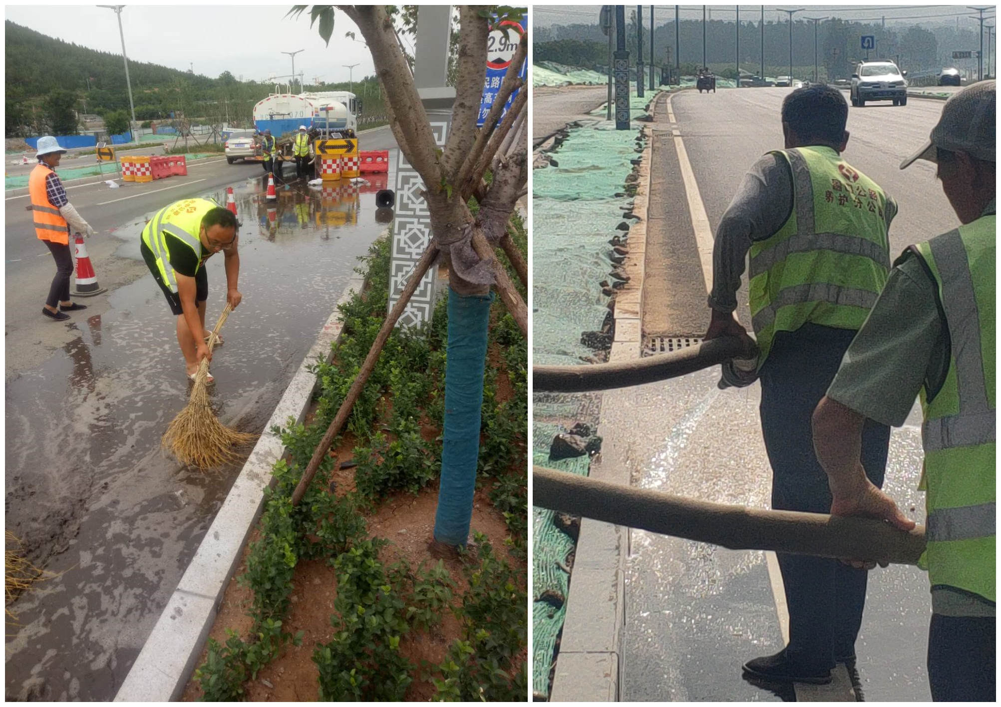 施工現(xiàn)場地面溫度超過40度,水灑到路面,很快就蒸發(fā),這種感覺就像在洗桑拿浴一樣,我們沂源縣人民路的小伙子們臉龐都曬的黝黑發(fā)亮,忍受著身上的衣衫被汗水濕透又被風(fēng)吹干,仍然一絲不茍的完成著自己的工作任務(wù)。