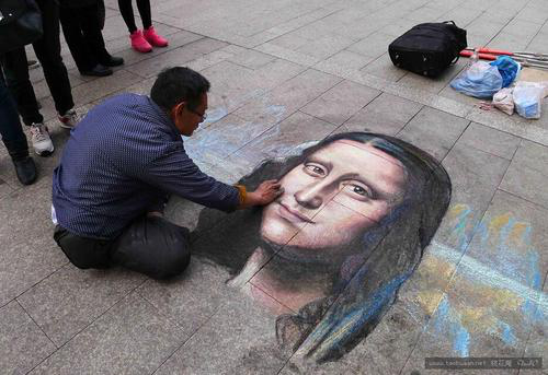 記得前幾天看到微信上的一篇推文,講述了“中國(guó)最牛乞丐”叢桂蘭的故事,可能他的事跡大家也是有所了解,一個(gè)破舊的行李包,一副拐杖,足以支撐他到處流浪35個(gè)年頭。16歲那年,他不幸得了骨腫瘤截肢,但命運(yùn)的不公并沒(méi)有泯滅他的夢(mèng)想,23歲那年他只身一人離開(kāi)家鄉(xiāng),開(kāi)啟了他的夢(mèng)想之路,起初雖懷著一顆熱愛(ài)繪畫(huà)的心,但因各種原因接觸到的專(zhuān)業(yè)知識(shí)少之又少,只能臨摹,在地上用粉筆畫(huà)一些簡(jiǎn)單的小狗小貓。他個(gè)人尤其熱愛(ài)達(dá)芬奇的畫(huà)作,剛開(kāi)始是臨摹,后來(lái)回家以后開(kāi)始研究蒙娜麗莎的傾斜度是怎樣的,頭到手是多大距離,后來(lái)經(jīng)過(guò)反復(fù)研究就將這些東西記在腦子里,到現(xiàn)在他已經(jīng)在地上畫(huà)過(guò)蒙娜麗莎800多次,長(zhǎng)2米左右,寬1.4米左右,反反復(fù)復(fù)用粉筆來(lái)回摩擦大概七八千次,差不多8個(gè)多小時(shí)才能完成,每次繪畫(huà)之前手上都要纏上厚厚的膠帶紙,雙手早已磨出了老繭,采訪時(shí)他說(shuō)道:“現(xiàn)在手上的老繭,即使是玻璃碴子扎一下也不會(huì)出血”。每次出攤畫(huà)畫(huà)的時(shí)候都會(huì)引來(lái)無(wú)數(shù)行人的圍觀,但是他對(duì)網(wǎng)友評(píng)價(jià)他是“中國(guó)最牛乞丐”并不是很適應(yīng),他說(shuō),乞丐是直接伸手去要,而我就是要憑本事吃飯,我不丟人也不卑微,我最大的夢(mèng)想就是去盧浮宮看蒙娜麗莎。
