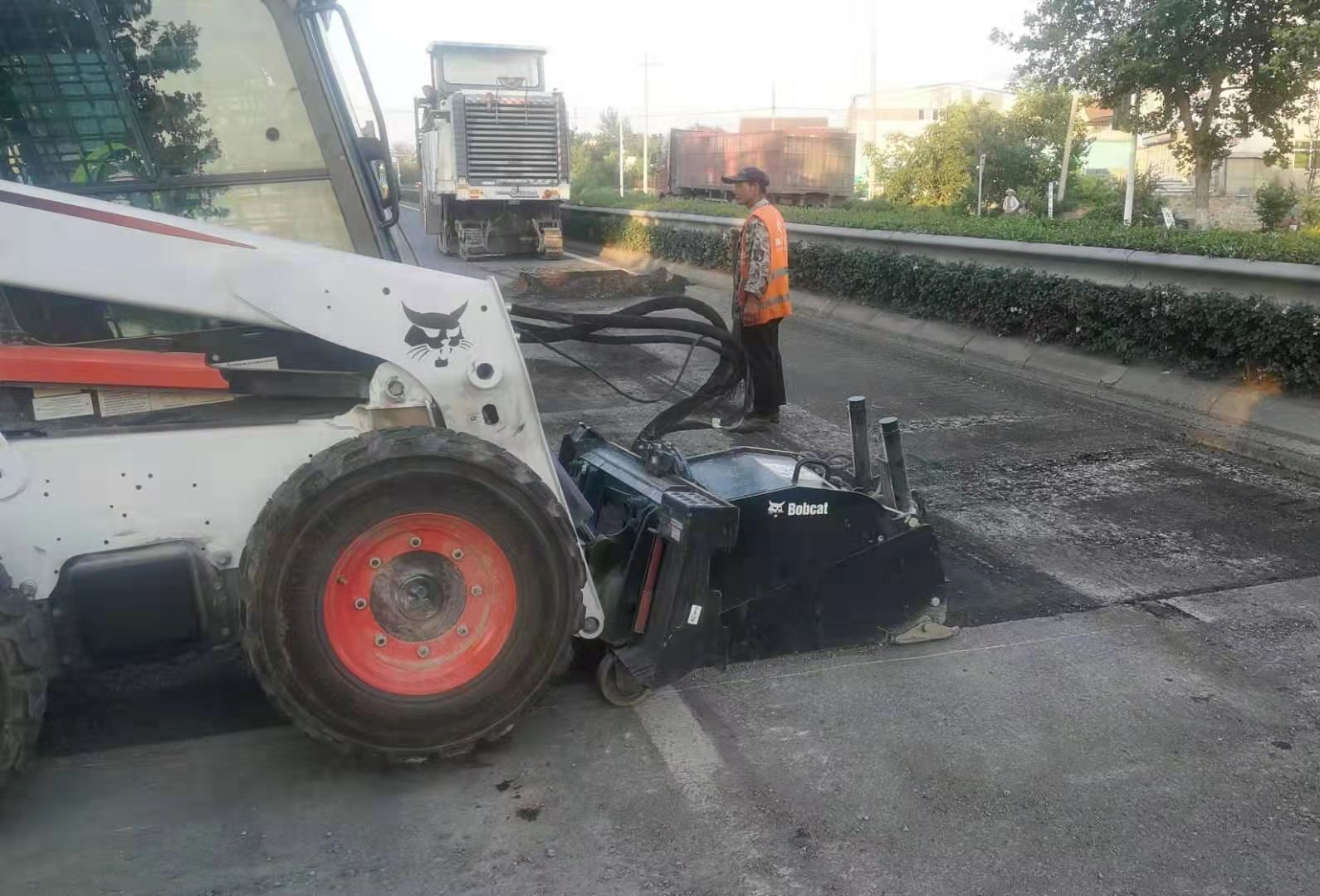 采用山貓對(duì)銑刨坑槽邊部進(jìn)行處理路面病害處理工作中,銑刨機(jī)的銑刨水平往往是制約坑槽施工質(zhì)量和進(jìn)度的重要因素。工地上經(jīng)常會(huì)出現(xiàn)因?yàn)殂娕贆C(jī)銑刨出的坑槽邊部不夠順直、存在參差不齊現(xiàn)象而導(dǎo)致驗(yàn)收不合格的現(xiàn)象,現(xiàn)在我們利用山貓對(duì)銑刨機(jī)銑刨后的坑槽邊部進(jìn)行處理,處理后的坑槽邊部如刀切一般整齊,不用再安排民工進(jìn)行電鎬處理。