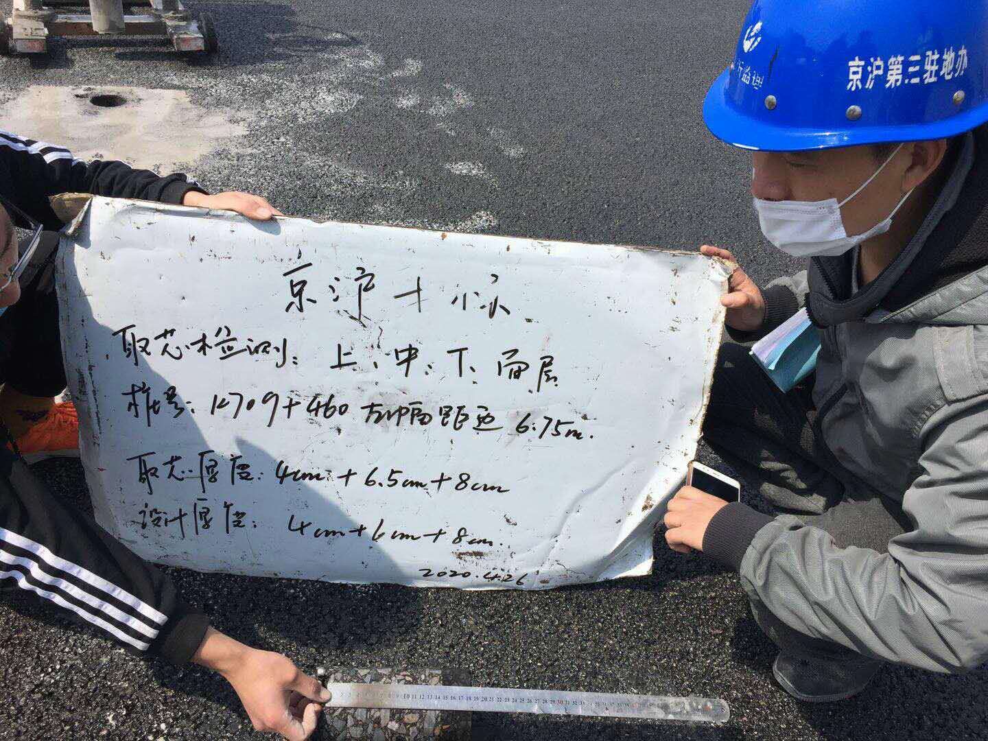 質(zhì)量是一個(gè)單位生存的基礎(chǔ),試驗(yàn)員馬興邦與監(jiān)理進(jìn)行厚度質(zhì)量檢測(cè)。