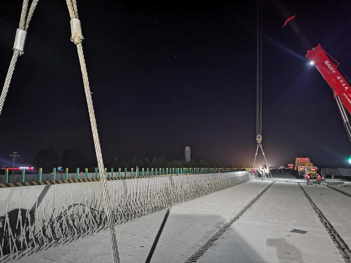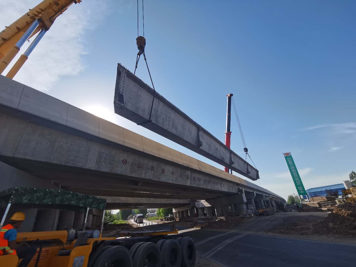 京滬高速公路萊蕪至臨沂段改擴(kuò)建工程第十標(biāo)段,由齊魯交通發(fā)展集團(tuán)投資,山東魯中公路建設(shè)有限公司承建,起訖點(diǎn)樁號(hào)K692+900-K710+000,路線全長(zhǎng)17.1km(含紅花埠互通一處、主線收費(fèi)站一處),設(shè)計(jì)速度120km/h,按雙向八車道標(biāo)準(zhǔn)進(jìn)行擴(kuò)建。我部于2020年1月18日率先完成第四階段全幅交通導(dǎo)改,右幅雙向通行,左幅封閉施工,進(jìn)行左幅老橋拆除新建和路面施工。其中K693+964.355歸昌特大橋,全長(zhǎng)共1233m,共14聯(lián),是我標(biāo)全線唯一的特大橋,也是全線重點(diǎn)控制工程之一,歸昌特大橋1-3聯(lián)上部結(jié)構(gòu)形式采用現(xiàn)澆普通鋼筋砼空心板、第10、12聯(lián)采用普通鋼筋砼現(xiàn)澆板(拆除新建)、第4-9、13、14聯(lián)采用預(yù)應(yīng)力砼(先張)橋面連續(xù)空心板(20m共435片,22.31m共5片)、第11聯(lián)采用預(yù)應(yīng)力砼(后張)簡(jiǎn)支小箱梁(40m共14片),下部結(jié)構(gòu)采用柱式墩+肋板臺(tái)。預(yù)制箱梁所處位為歸昌特大橋第11聯(lián)拆除新建,上跨G310國(guó)道,車流量較大,施工吊裝難度風(fēng)險(xiǎn)大,為確保歸昌特大橋左幅最后5片預(yù)制箱梁順利架設(shè),我部首先進(jìn)行優(yōu)化施工方案、細(xì)化工作計(jì)劃、強(qiáng)化施工組織,成立專門的領(lǐng)導(dǎo)小組,合理進(jìn)行資源配置,然后施工前對(duì)現(xiàn)場(chǎng)施工人員進(jìn)行安全、質(zhì)量技術(shù)交底,讓現(xiàn)場(chǎng)每位施工人員能夠熟悉架梁流程及施工安全注意事項(xiàng),提高安全生產(chǎn)意識(shí),嚴(yán)格按照技術(shù)規(guī)范及要求精細(xì)架設(shè)。5月10日我部開始進(jìn)行箱梁吊裝前一系列準(zhǔn)備工作,本次吊裝采用2輛400t汽車吊雙機(jī)起吊的形式進(jìn)行施工,在箱梁運(yùn)輸和架設(shè)過程中,項(xiàng)目部領(lǐng)導(dǎo)親自在現(xiàn)場(chǎng)指揮,我部克服了天氣及運(yùn)梁線路條件復(fù)雜、上跨G310國(guó)道等不利因素,在全體人員的共同努力下,于5月11日晚20:10分將左幅最后5片預(yù)制箱梁全部順利吊裝到位,實(shí)現(xiàn)主線全線貫通。
