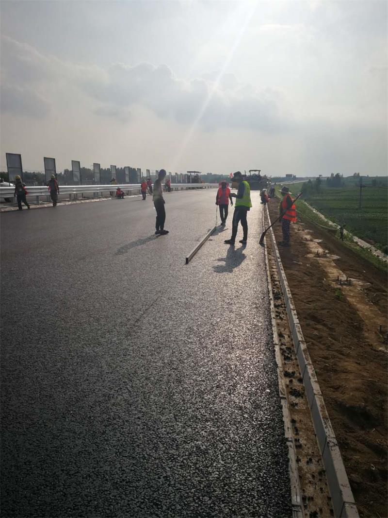 為保證瀝青上面層試驗段的順利開工并取得預期效果,新寧項目部合理組織,積極做好開工前的技術安全交底工作,同時對試驗段的中面層瀝青進行了工作面清理;試鋪過程中,嚴格管控混合料拌合、運輸、攤鋪、碾壓、成品保護等??偙O(jiān)辦與交科院等相關人員在現(xiàn)場全程觀摩指導工作,經(jīng)現(xiàn)場檢測,瀝青厚度、表面平整度、寬度等各項技術指標均符合設計規(guī)范與質(zhì)量標準。