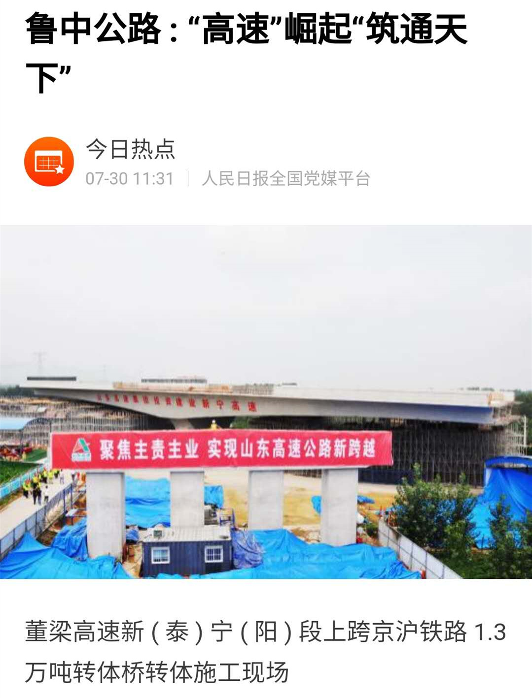 2020年7月30日,《淄博日報》4版刊登了題為《董梁高速新(泰)寧(陽)段上跨京滬鐵路1.3萬噸轉(zhuǎn)體橋成功轉(zhuǎn)身,淄博路企“走出去”再豎里程碑——魯中公路:“高速”崛起“筑通天下”》的文章。