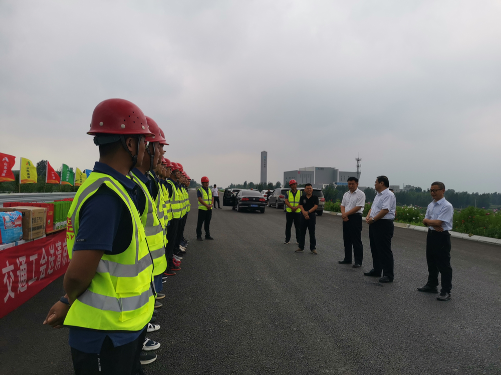 在青蘭二標(biāo)段汶河路分離立交現(xiàn)場(chǎng),王迎軍詳細(xì)了解了項(xiàng)目進(jìn)展情況,并傳達(dá)省交通廳對(duì)青蘭萊泰一線(xiàn)員工的關(guān)懷和問(wèn)候,對(duì)青蘭項(xiàng)目部面對(duì)新冠疫情和當(dāng)前高溫多雨天氣等種種不利因素,在開(kāi)工最晚、工期最緊的情況下,始終堅(jiān)持實(shí)現(xiàn)2020年底通車(chē)目標(biāo)不動(dòng)搖,不斷提高政治站位,科學(xué)組織,精心安排,在質(zhì)量、安全、環(huán)保、進(jìn)度各方面始終保持全線(xiàn)領(lǐng)跑地位給予了高度評(píng)價(jià)。對(duì)全體參建人員積極作為,主動(dòng)作為,敢想敢干,敢闖敢拼的工作作風(fēng)給予充分肯定。