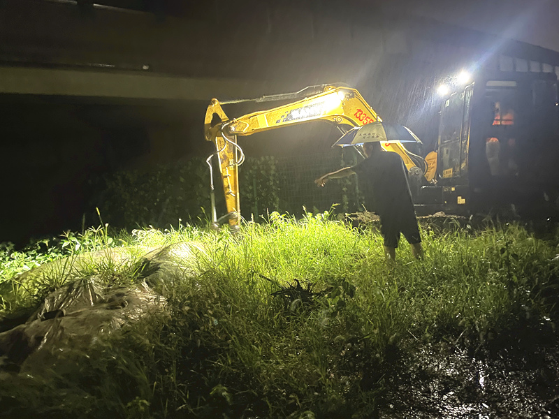 7月28日晚至29日凌晨,各項(xiàng)目按照會(huì)議部署分工,迅速展開(kāi)行動(dòng)。隨著雨勢(shì)增加,部分排水系統(tǒng)出現(xiàn)不同程度的堵塞積水,各負(fù)責(zé)值班人員及時(shí)協(xié)調(diào)挖機(jī)及抽水泵,及時(shí)對(duì)現(xiàn)場(chǎng)情況進(jìn)行處置。分公司領(lǐng)導(dǎo)靠前指揮,實(shí)時(shí)對(duì)現(xiàn)場(chǎng)情況進(jìn)行詢(xún)問(wèn),親自協(xié)調(diào)調(diào)度現(xiàn)場(chǎng)排水情況。值班人員以雨為令,落實(shí)值班值守制度,風(fēng)雨中全力拼搶?zhuān)WC群眾人身不受傷害、農(nóng)田不被“侵犯”,一整夜,值班人員對(duì)現(xiàn)場(chǎng)負(fù)責(zé)區(qū)域進(jìn)行盯控排查,每小時(shí)對(duì)負(fù)責(zé)區(qū)域內(nèi)情況進(jìn)行報(bào)備,雨水與汗水交融,崗位與職責(zé)同在。