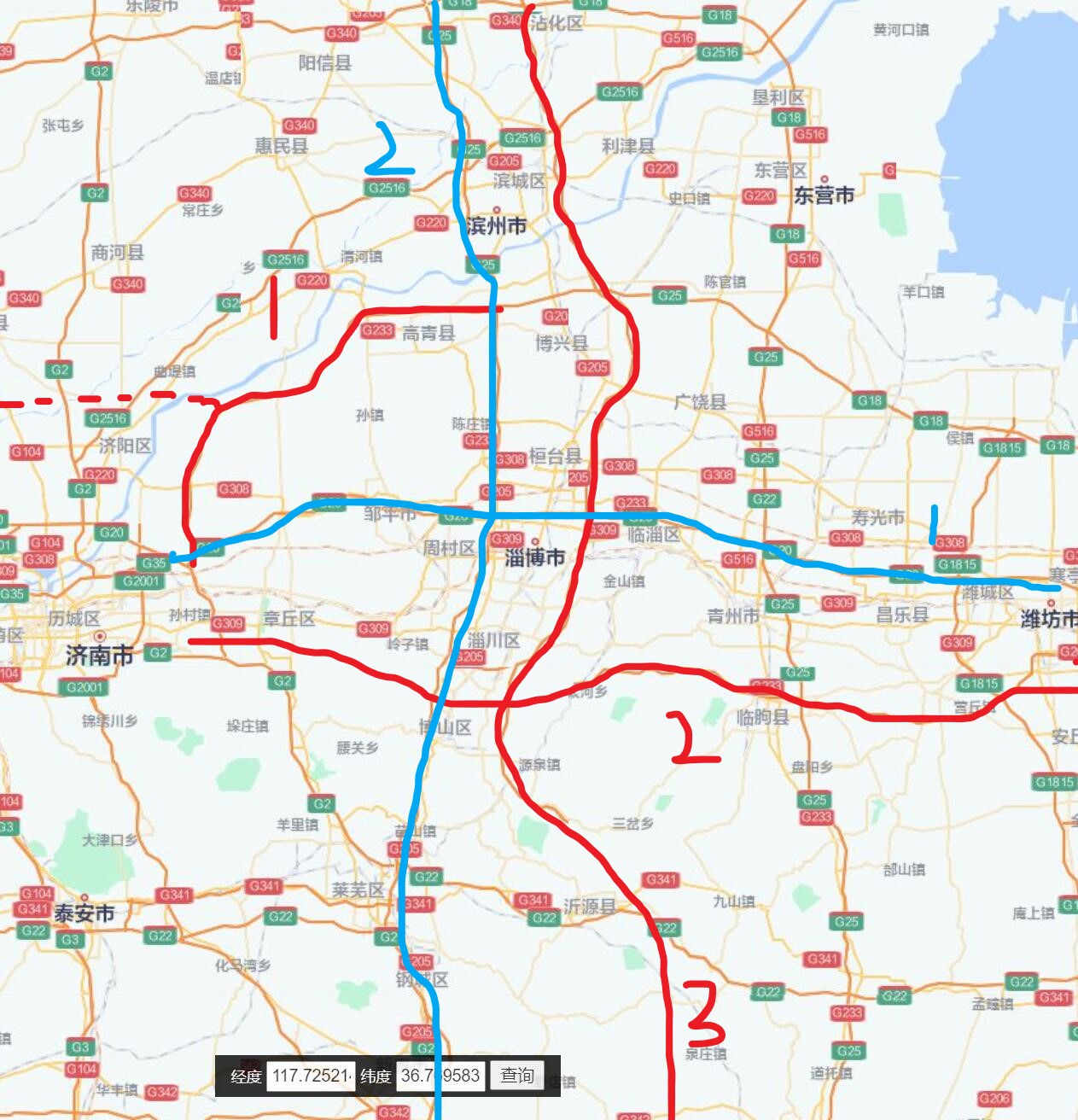 一豎是濱萊高速 已經(jīng)八車道改造,縱穿淄博境內(nèi),是一條非常重要的南北大通道。