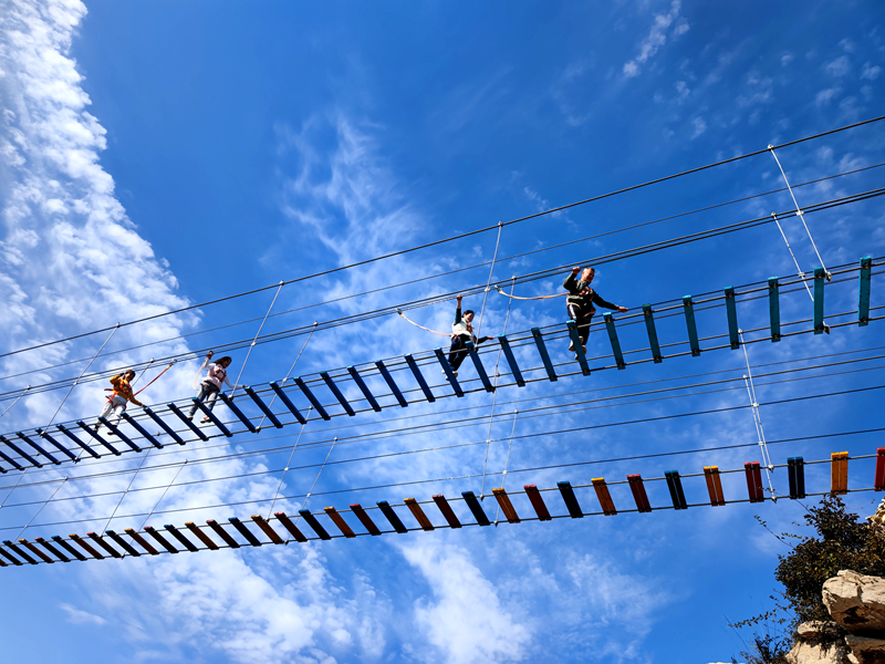 10月23日上午陽光燦爛,山東魯中公路第三工程公司員工與家屬們,沿著山峪林間石徑一路在山村古建筑中穿行而過,一行人一路相互鼓舞拾級盤旋而上經(jīng)玻璃棧道參觀了亞洲最大全琉璃藥師佛像,踏上玻璃懸索橋體驗了一把凌空俯攬群山的樂趣,踩在高空步云橋上感覺自己的自信心嚴重爆表。齊長城上這邊鼓槌舞動沖鋒的戰(zhàn)鼓擂地震天響,那邊凱旋鑼聲已經(jīng)響徹山谷。穿行棧道,或激流中漂流而下,或溜索飛躍柿巖,或直接就從山間羊腸小道一路小跑凱旋而歸。