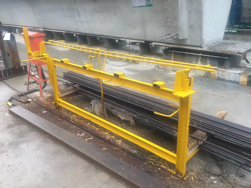 按照圖紙設(shè)計,該鋼筋縱向間距50cm,橫向隨頂板橫筋布置,每根橫筋布置5根。初期施工時,加工了頂板筋臺架,頂板筋在臺架上全部綁扎完成,工人在成型的鋼筋頂部利用兩側(cè)臺架搭設(shè)工作平臺,蹲在平臺上后退著逐個焊接拉結(jié)筋??v向通過拉線,橫向通過尺量定位,功效慢,干擾多,勞動強度大,定位不準(zhǔn)確,線形不順直,外觀質(zhì)量較差。