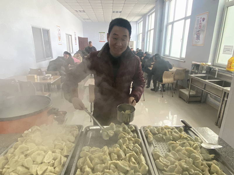 食堂師傅們精心挑選新鮮的豬肉、白菜、雞蛋、波菜等餡料,吃過早飯便開始拌餡、和面,同事們陸續(xù)來到食堂,搟皮、包餃子,大家各自分工,緊張有序的忙碌著。過程中,廚房里一片歡聲笑語,放下緊張而繁忙的工作,讓大家感受到家一樣的溫暖。