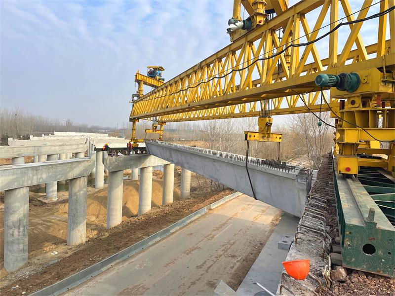 白馬河大橋全長219.5米,橋梁上部結(jié)構(gòu)采用30m裝配式預(yù)應(yīng)力混凝土連續(xù)箱梁,共七跨,一跨12片共計84片。經(jīng)過項目人員的共同努力,白馬河大橋橋梁下部結(jié)構(gòu)已于21年年底完工。復(fù)工伊始,項目部就及時協(xié)調(diào)架橋機進場、安裝、調(diào)試,準備進行架設(shè)工作。在人力、物力、機械、計劃等方面項目部可是做足了功夫,結(jié)合施工實際情況及時與業(yè)主監(jiān)理方面對接進行方案調(diào)整;組織好人員抓好對梁板預(yù)制、儲存、運輸?shù)拳h(huán)節(jié)的細節(jié)把控;聯(lián)系地方交通管制部門,規(guī)劃運梁路線;協(xié)調(diào)監(jiān)理及施工隊伍進行梁板架設(shè)前的安全技術(shù)交底;安全隊伍在沿線增設(shè)警示標(biāo)志,警示過往行人及車輛。現(xiàn)場支座安裝完成后,梁板進入架橋機準備進行架設(shè),架設(shè)檢查合格完成后進行臨時加固,報監(jiān)理工程師檢查,監(jiān)理工程師檢查完成后方可進行下一片梁板的吊裝架設(shè)。整個過程緊張而有序的進行著,項目部盡早準備、精心組織、有序協(xié)作的工作方式贏得了業(yè)主及監(jiān)理單位的一致好評。