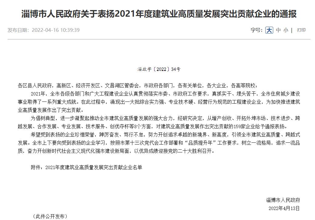 公司獲淄博市政府、淄博市住房和城鄉(xiāng)建設局通報表揚
