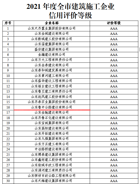 4月29日,淄博市住房和城鄉(xiāng)建設局發(fā)布《關(guān)于2021年度淄博市房地產(chǎn)開發(fā)企業(yè)、建筑施工企業(yè)、招標代理機構(gòu)、項目經(jīng)理信用評價等級結(jié)果的通報》,我公司被評為AAA級信用企業(yè)。全市共1131家建筑施工企業(yè)參評,AAA級60家、AA級121家、A級844家、B級99家、C級7家。自2019年至今,公司連續(xù)被評為淄博市建筑施工AAA級信用企業(yè),被列為淄博市建筑市場責任主體信用“紅名單”。