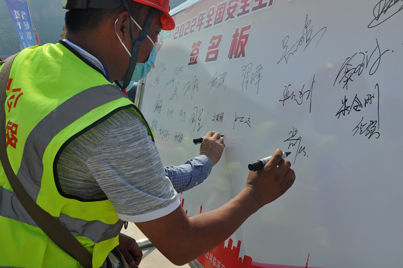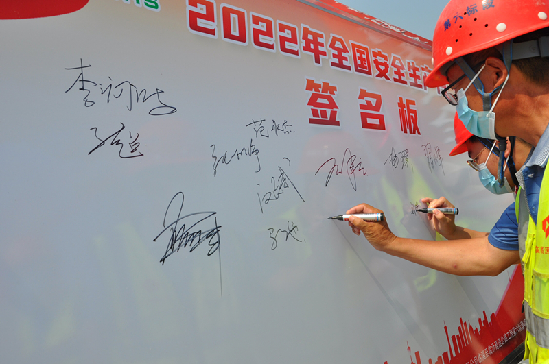 公司總部、臨臨項目和駐地監(jiān)理代表聯(lián)手點亮“安全生產月”活動啟動球,2022“安全生產月”正式啟動。隨后,全體參與人員滿載著決心與信心在安全展板上鄭重簽下姓名。