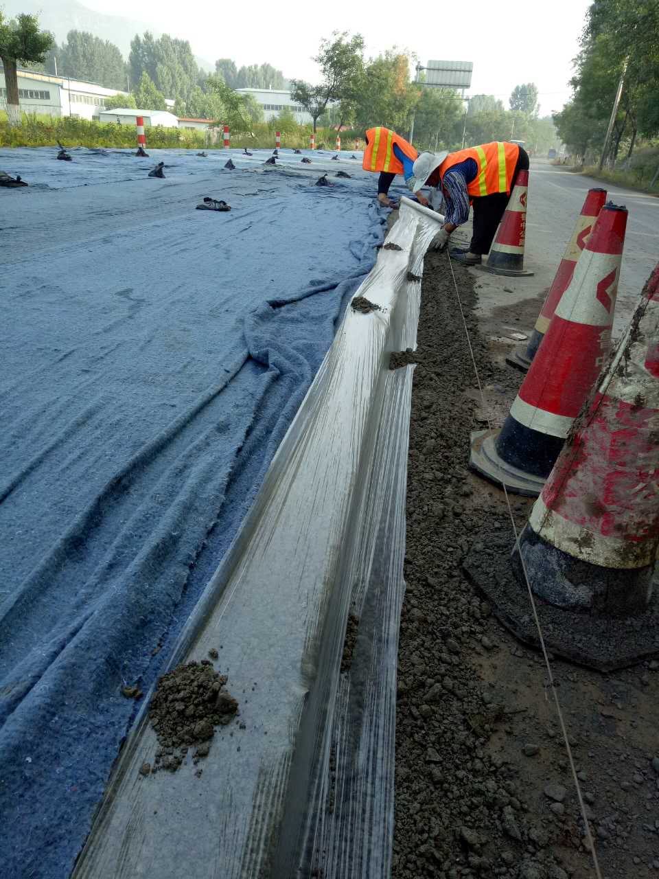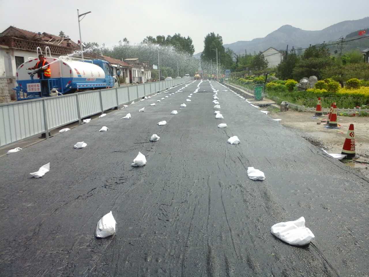 中修段基層覆蓋雙層養(yǎng)生毯并側(cè)噴灑水養(yǎng)生。