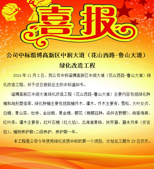 公司中標(biāo)淄博高新區(qū)中潤(rùn)大道(花山西路-魯山大道)綠化改造工程