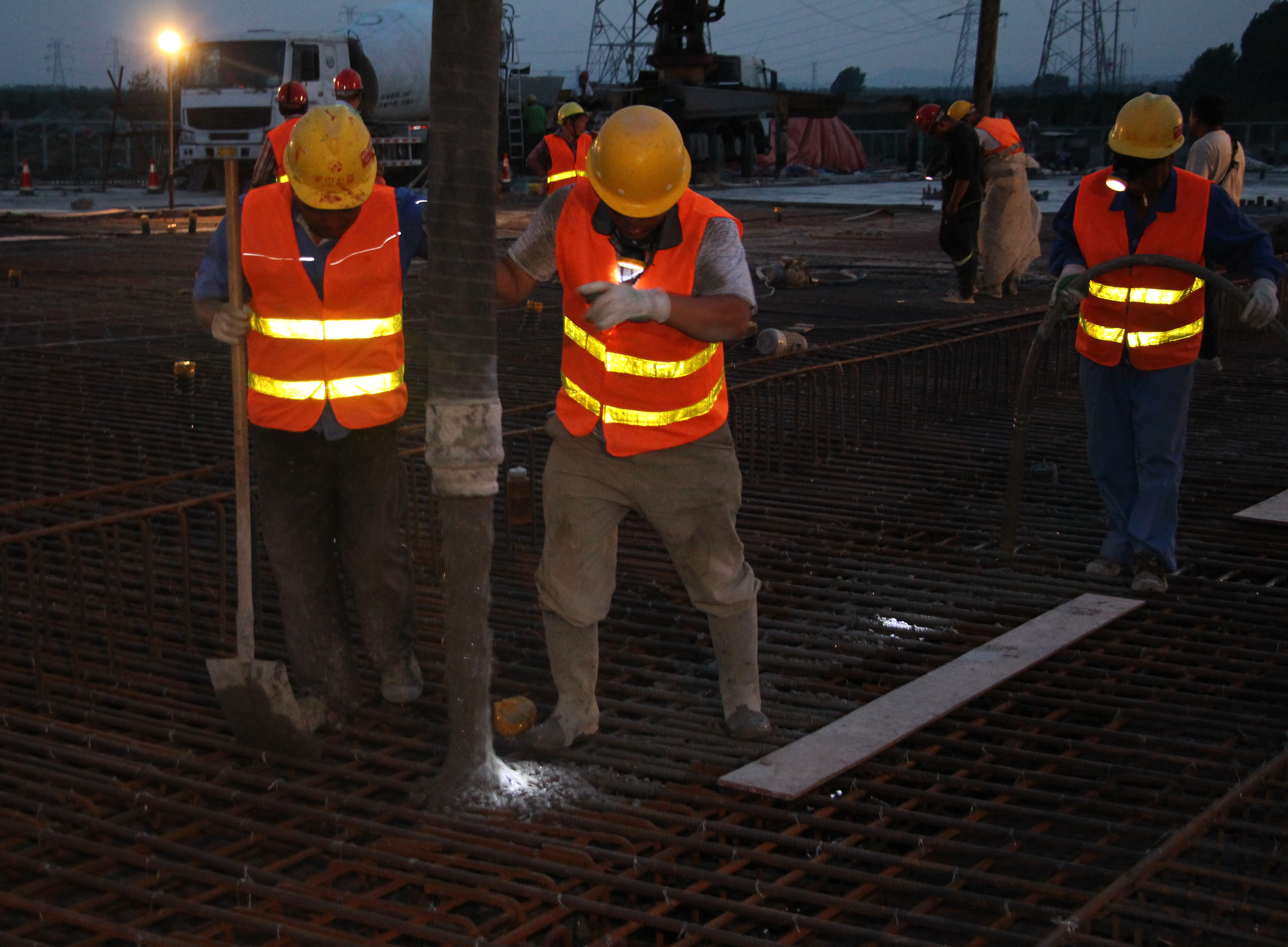 6月18日夜間,混凝土澆筑現(xiàn)場(chǎng)的施工人員忙碌的工作著