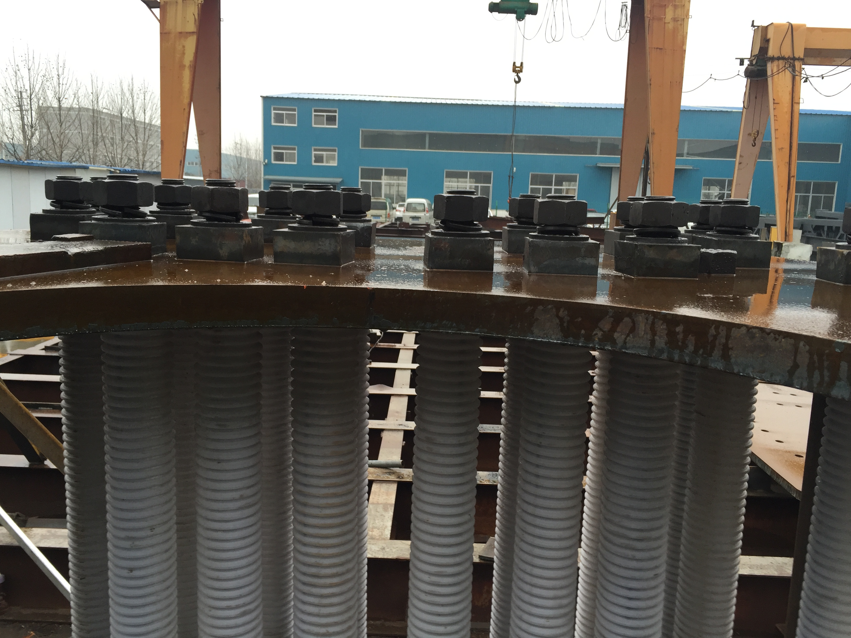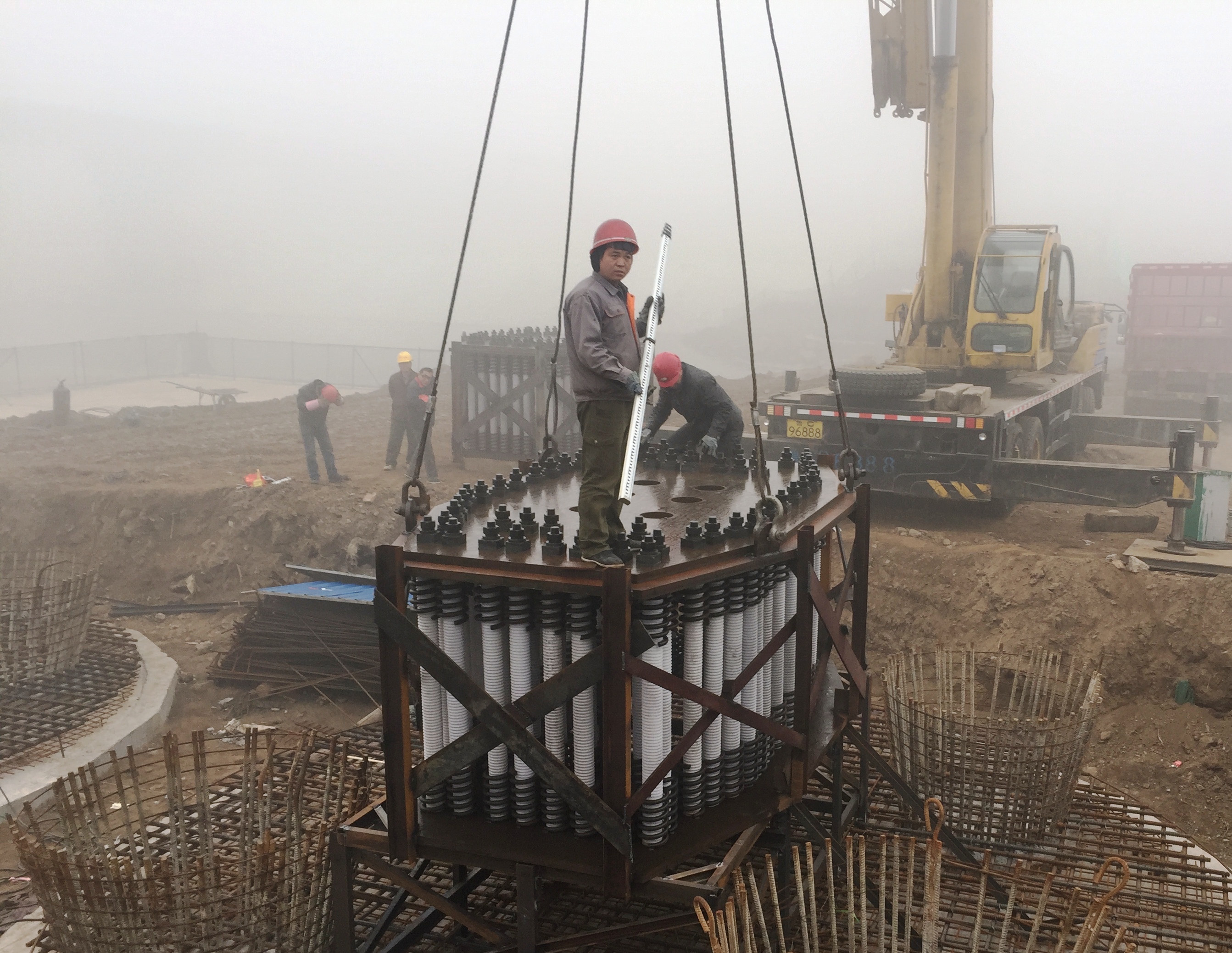 2016年12月13日,組裝起來的預(yù)埋鋼板框架,高強(qiáng)度螺栓密集排列,單個主塔就需要58套。