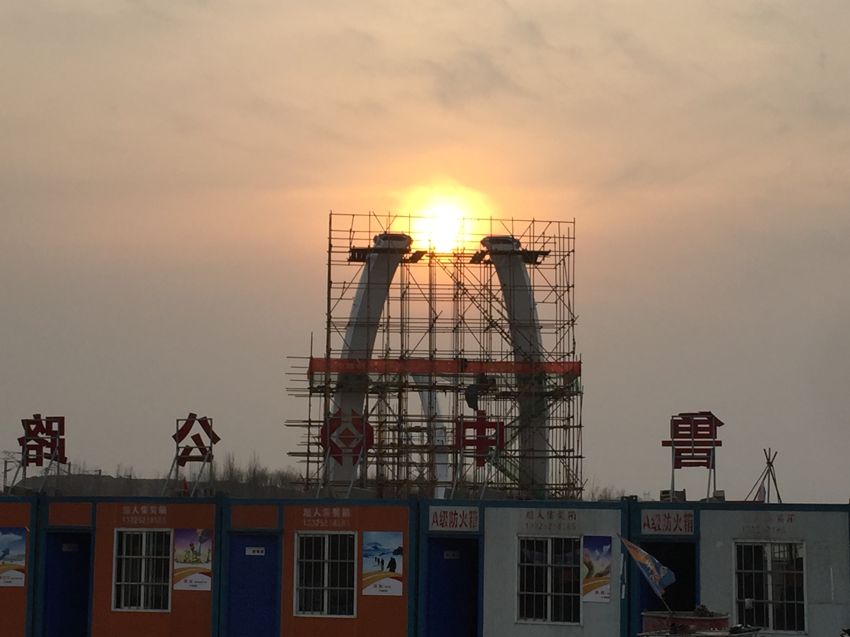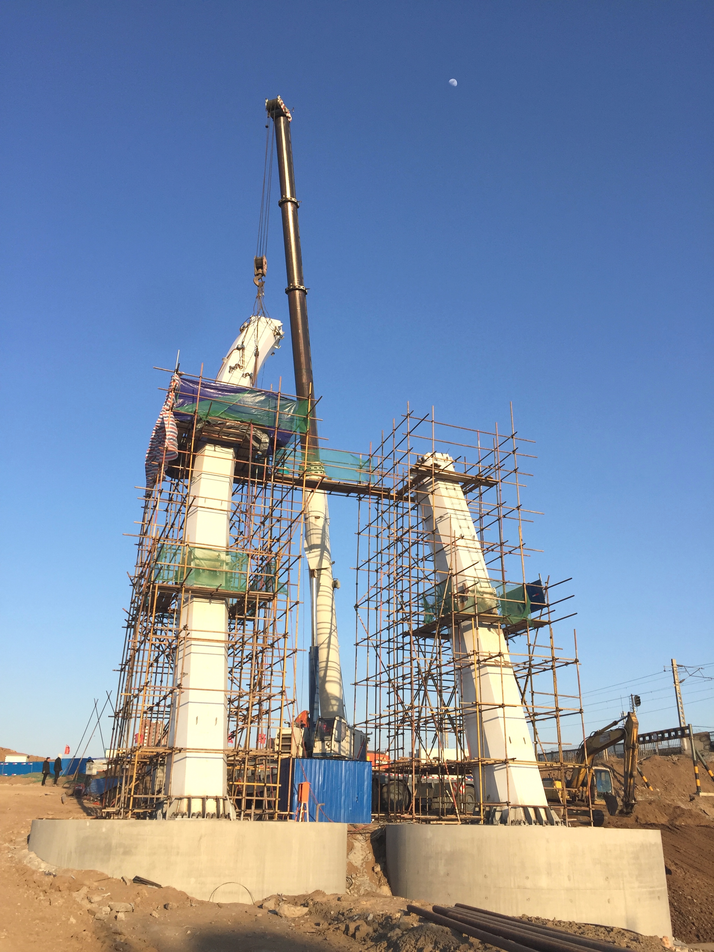 2017年2月28日,鋼主塔施工搭設(shè)腳手架。