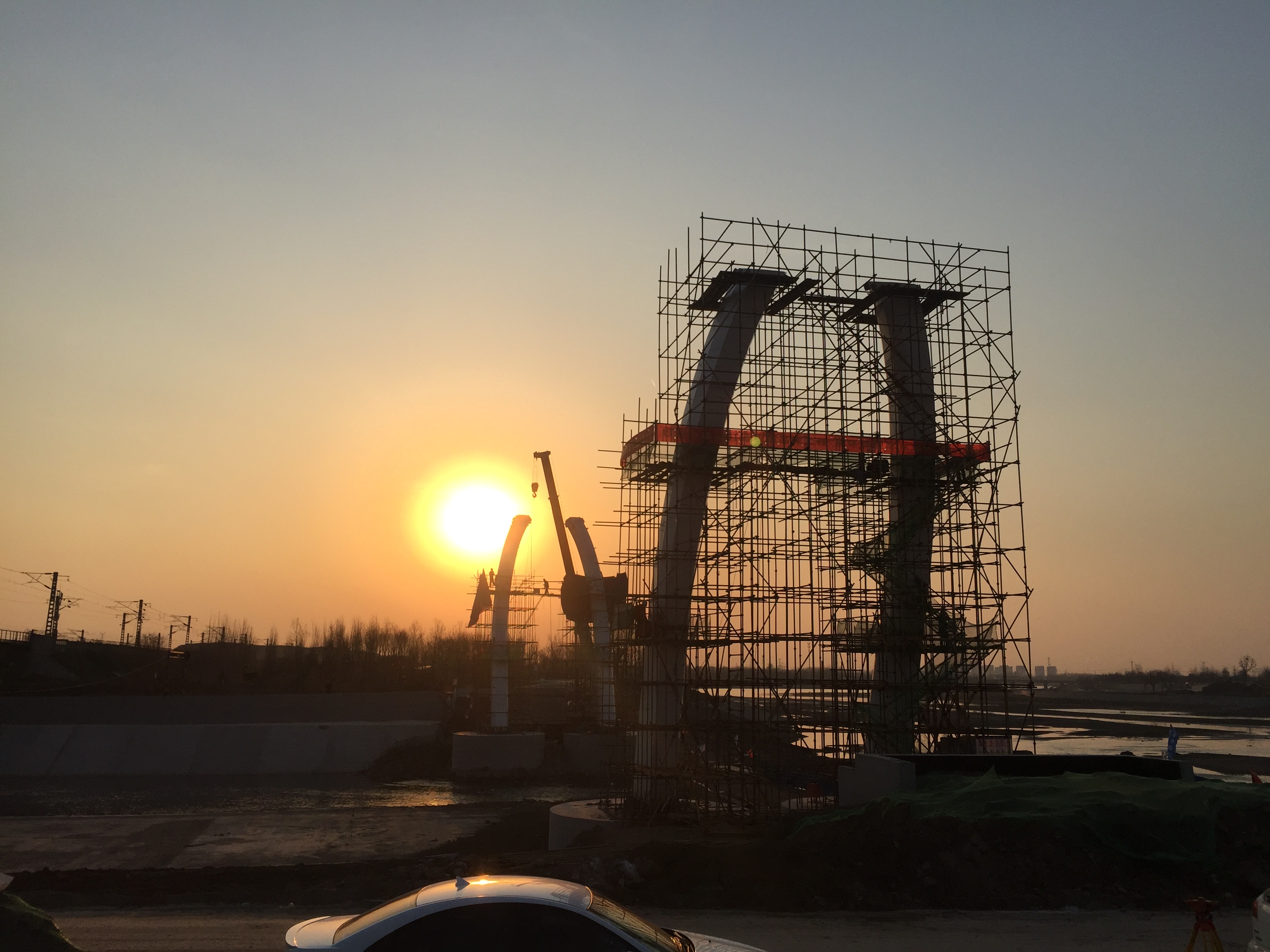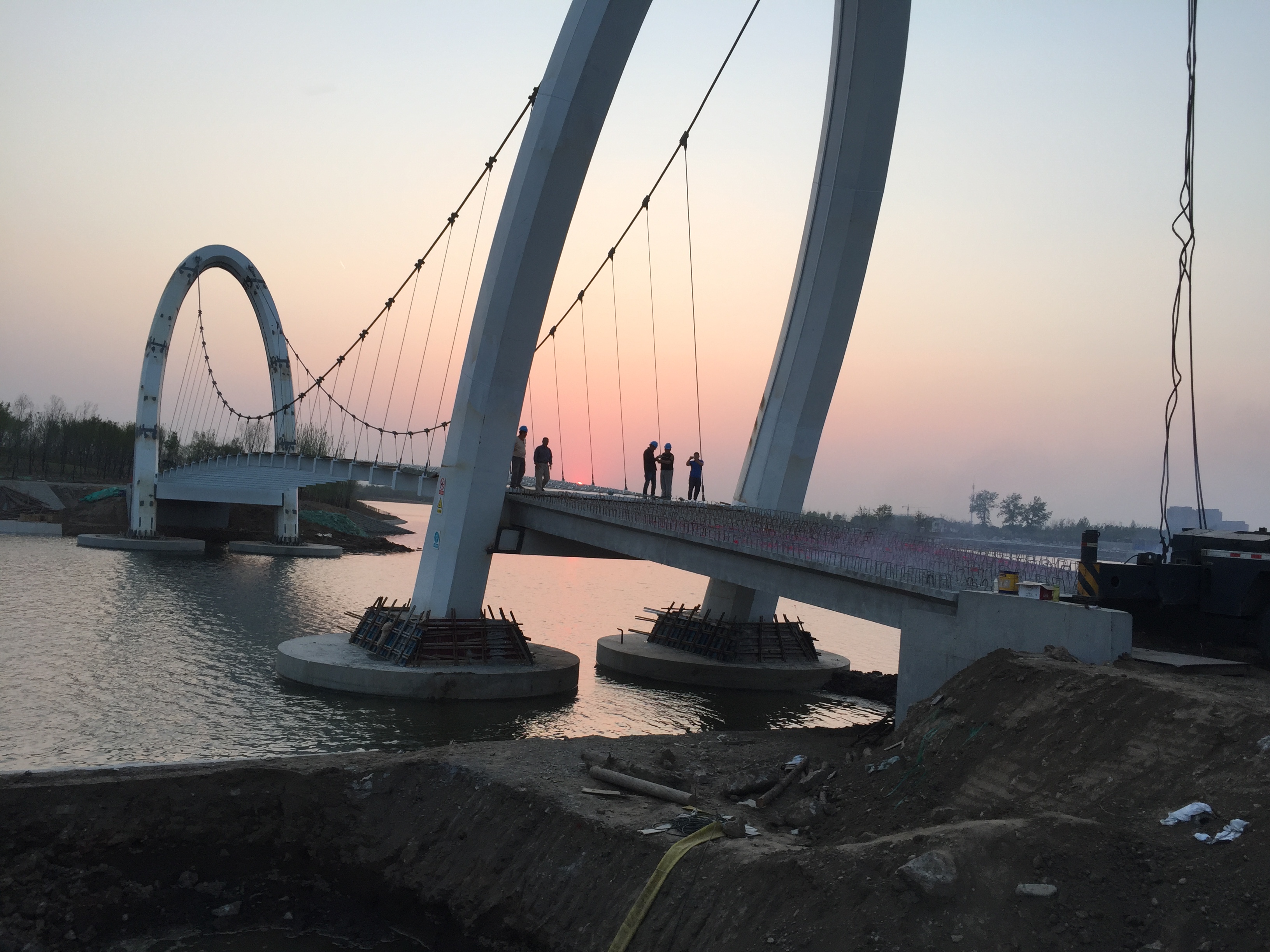 2017年4月22日,晨曦中引梁橋板開始吊裝。