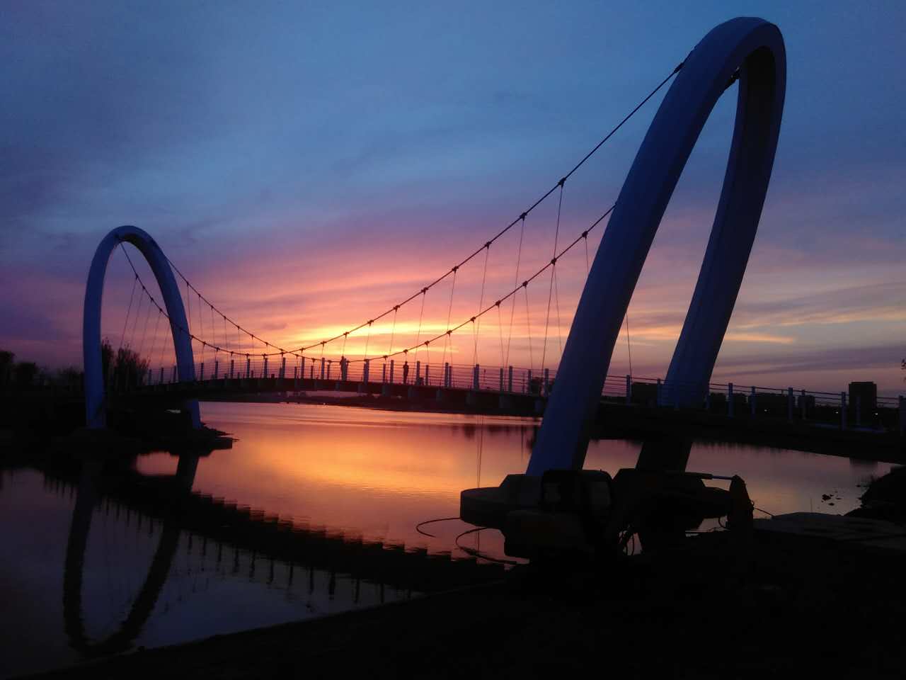 美麗的孝婦河濕地公園內(nèi)矗立著一座雄偉的白色懸索橋,它緊鄰膠濟(jì)鐵路客貨雙線橋,橫跨孝婦河?xùn)|西兩岸,遠(yuǎn)遠(yuǎn)望去猶如一條鋼鐵巨龍?jiān)陉柟庀蚂陟谏x。陽光下,碧波蕩漾,懸索橋意氣風(fēng)發(fā)盤踞在水波之中;夜空中,星輝閃耀,懸索橋潔白如玉與銀河相互輝映。這就是由我山東魯中公路建設(shè)有限公司所承建的淄博市第一座鋼結(jié)構(gòu)懸索橋。