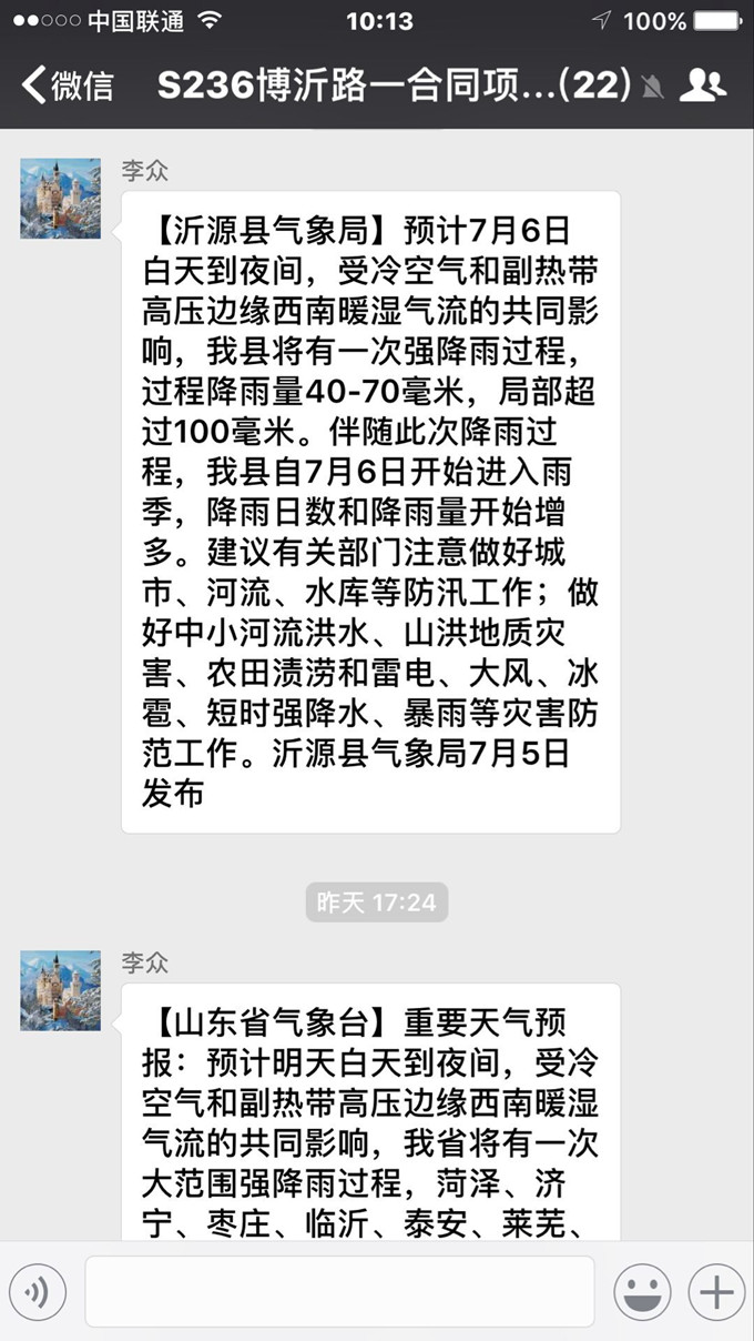 項目部負責人每天保持對天氣預報的收聽,對發(fā)生或者可能發(fā)生的突發(fā)防汛事件,及時通報,讓大家防患于未然,在出現(xiàn)緊急情況時能快速協(xié)助各施工隊做好恢復生產(chǎn)工作。