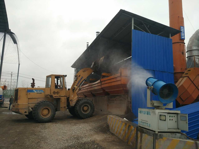 裝載機鏟廢料時,防止環(huán)境污染,霧炮進行噴淋
