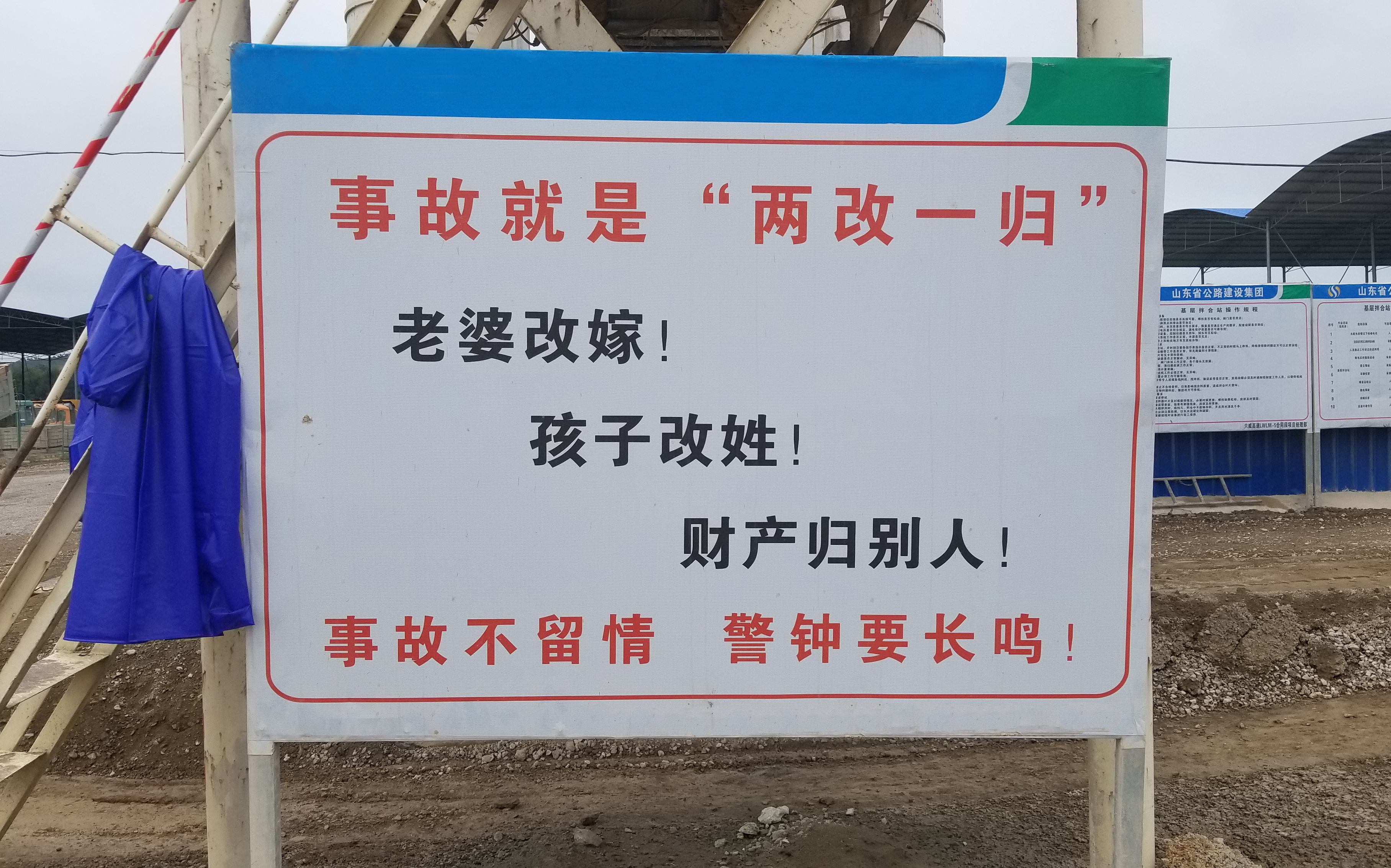 其次,安全,宣傳很重要。在一工區(qū)項(xiàng)目部的拌合站有這樣一個警示牌:事故后果就是老婆改嫁,孩子改姓,財產(chǎn)歸別人!當(dāng)時我記得周圍的人都在取笑這個警示牌的內(nèi)容,包括我也覺著有點(diǎn)太通俗了點(diǎn)吧??墒乾F(xiàn)在的我并不覺著可笑了,覺著是那么的真實(shí),甚至是可怕。通過宣傳教育,將安全觀念深入每個人的心里,安全工作才會真正的起到效果。