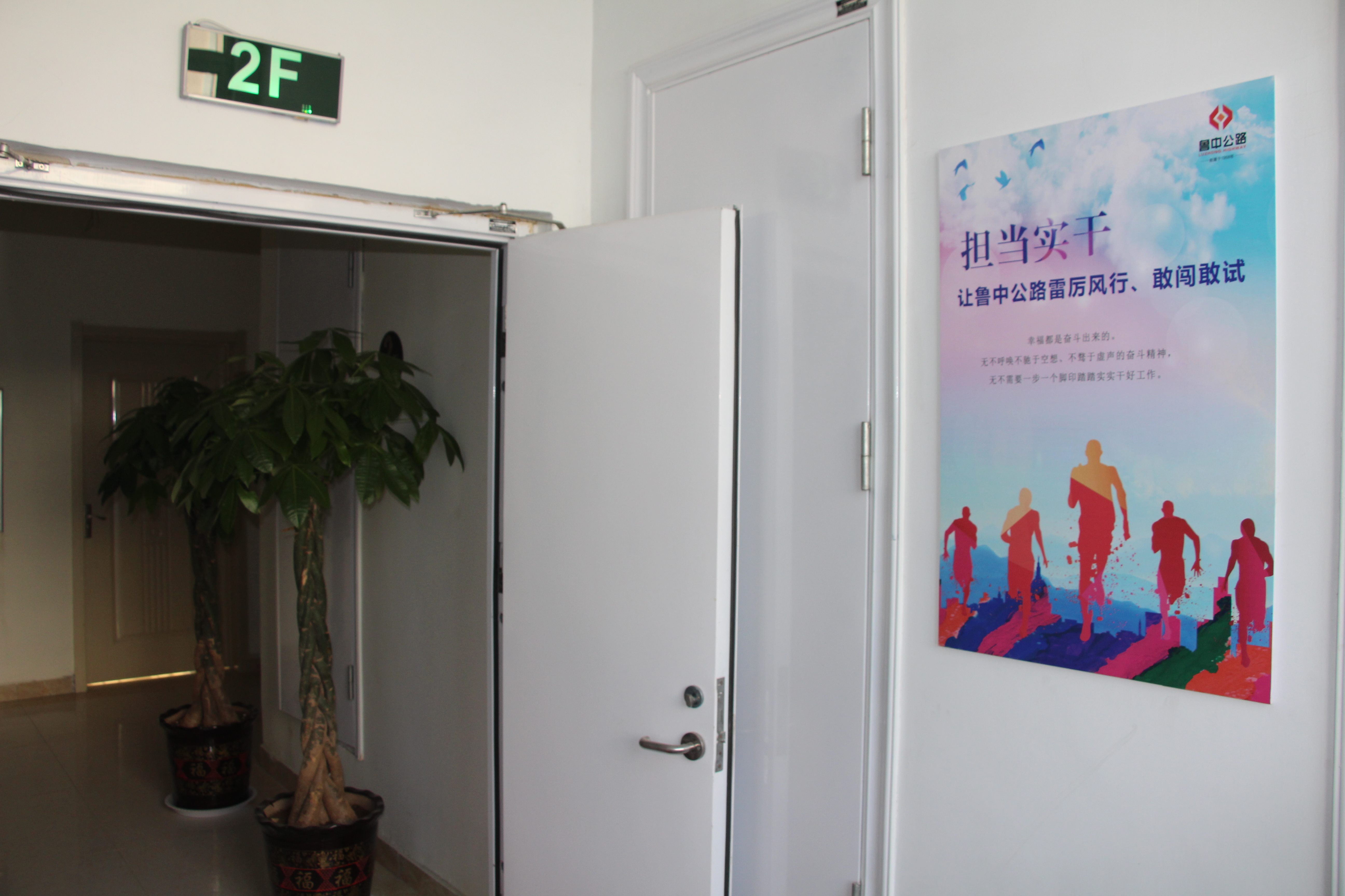 推開項(xiàng)目部大門,進(jìn)入一樓大廳內(nèi),首先映入眼簾的是魯中公路標(biāo)志及文化標(biāo)語。