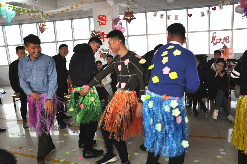 一個(gè)個(gè)游戲下來(lái),聰明能干、呆萌踏實(shí)的小伙子們已經(jīng)打動(dòng)了姑娘們的芳心,但魯中公路小伙子的身上不僅僅只有這些亮點(diǎn),還有幽默、豁達(dá)、鮮活的另一面。隨著主持人的指令,手掌互動(dòng)的小游戲選出了需要被懲罰的人。小伙子們主動(dòng)請(qǐng)纓替女生受罰,身著草裙的他們開(kāi)始“舞動(dòng)人生”。婀娜的舞姿、妖嬈的步伐引來(lái)全場(chǎng)的陣陣笑聲,把整個(gè)會(huì)場(chǎng)氣氛推向高潮。
