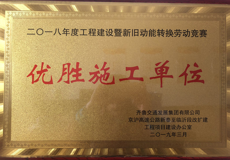 2019年3月9日,京滬臨沂項目辦舉行2019年加快工程建設暨“春季百日大干”動員大會上,表彰了2018年涌現(xiàn)出的先進單位和先進個人,山東魯中公路建設有限公司作為京滬高速公路建設的排頭兵,一直兢兢業(yè)業(yè),恪盡職守,嚴格按照公司部署,執(zhí)行公司決定,堅定不移、不打折扣地落實,發(fā)揚魯中人吃苦耐勞,團結協(xié)作的精神,樹立敢闖敢拼,廢寢忘食的先進典型,以點帶面,共同進步。