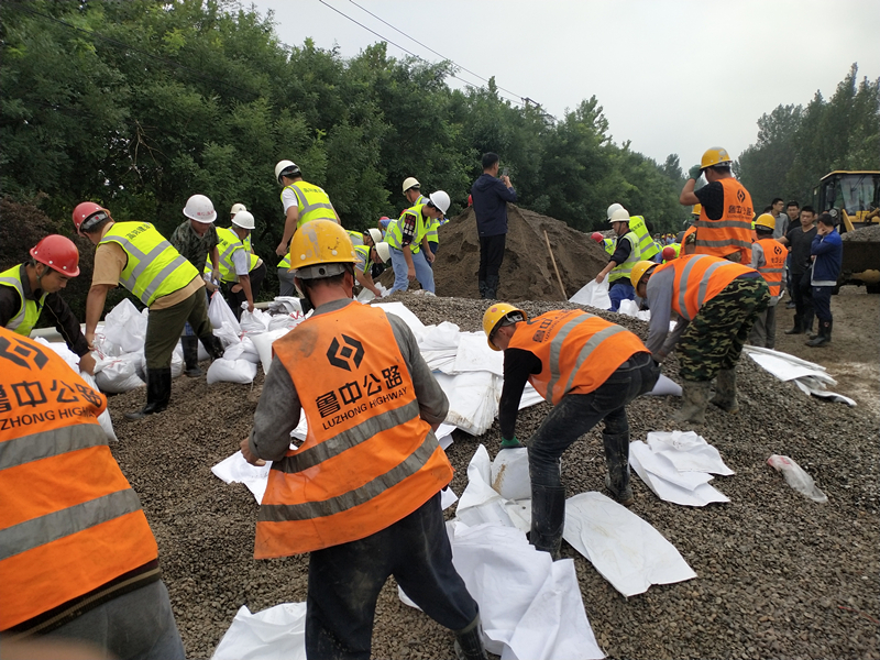 受“利奇馬”影響,8月10號(hào)到12號(hào)淄博市普降暴雨,孝婦河水位暴漲,袁家橋村段發(fā)生兩處50米、10米的決口,附近村莊被淹,情況危急。在項(xiàng)目自身受到臺(tái)風(fēng)與洪水影響的情況下,魯中公路經(jīng)開區(qū)分公司自8月11日17時(shí)開始,分批次投入搶險(xiǎn)人員34人,搶險(xiǎn)車輛7臺(tái),冒雨投入到抗洪救災(zāi)搶險(xiǎn)工作中。8月12日4時(shí),魯中公路柳園路孝婦河橋項(xiàng)目部又組織11人救援小組與一臺(tái)裝載機(jī)雨中再次奔赴搶險(xiǎn)救援現(xiàn)場。在省、市、開發(fā)區(qū)、及市交通運(yùn)輸局等領(lǐng)導(dǎo)的督導(dǎo)下,水利專家的指導(dǎo)下,魯中公路與500多名武警官兵、公安干警、消防戰(zhàn)士,及經(jīng)開區(qū)管委會(huì)、經(jīng)開區(qū)各施工單位,當(dāng)?shù)孛癖姷?000多人經(jīng)過兩天近50個(gè)小時(shí)的日夜奮戰(zhàn),8月13日下午16時(shí),袁家橋段缺口成功堵住。