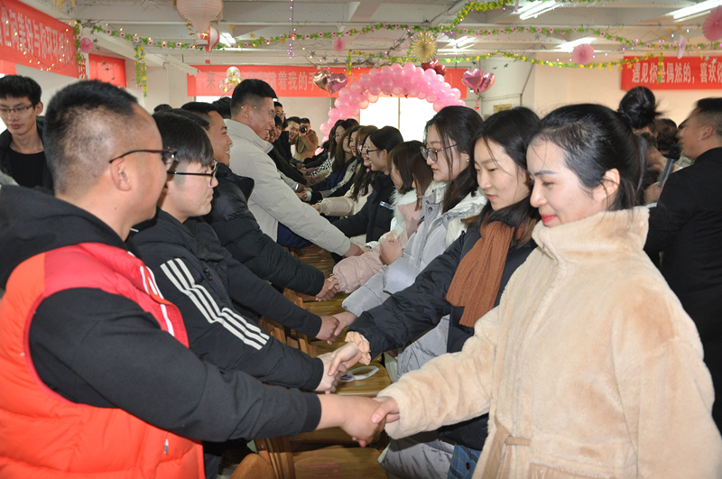下午13:00過后,小姑娘們陸續(xù)到場(chǎng),小伙子們有忙著在寒風(fēng)中殷勤迎賓的,有在會(huì)場(chǎng)給姑娘們拍照留念的,有忙活著端茶遞糖的,還有幾個(gè)看傻了眼的,說話聲、歡笑聲不絕于耳,整個(gè)會(huì)場(chǎng)瞬間燃了起來。13:30分,活動(dòng)準(zhǔn)點(diǎn)開始,西南分公司的王琨發(fā)來書信分享了他通過聯(lián)誼會(huì)締結(jié)良緣的喜悅,工程管理部李乾親自到現(xiàn)場(chǎng)傳授收獲愛情的經(jīng)驗(yàn),氣氛也隨著他們的分享逐漸親切起來,順延著這份美好的祝福,男孩子們?yōu)樵趫?chǎng)的所有女生圍上了他們準(zhǔn)備的毛絨圍脖,系住這份溫暖,記住這份緣份。