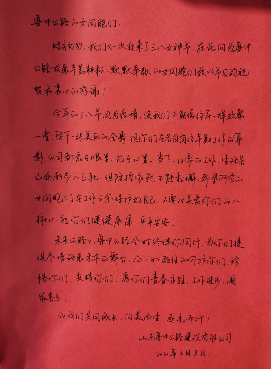 能加入公路人隊伍的女孩子,都是些勇氣可嘉、心有抱負的可愛姑娘,行業(yè)性質決定了她們有木蘭一樣的決心和仗劍走天涯的灑脫。也因此,一年一度的“三八節(jié)”對魯中公路女員工來說,總是別有一番意義,每年這一天,大家會從各自的工地、崗位團聚到一起,嘮嘮工作趣談,看看彼此變化,聊聊未來愿望。今年,由于疫情原因,熱熱鬧鬧的聚會無法實現(xiàn),但公司早早的為全體女員工精心準備了禮物與慰問信,向疫情期間仍在崗位上奮斗的女同胞們表示衷心感謝和節(jié)日的祝賀。