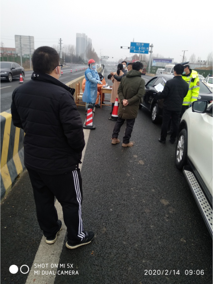等待了一個小時二十分鐘后,看到業(yè)主拿著政府的批準(zhǔn)文件跟防疫人員交涉。此后代理和業(yè)主帶領(lǐng)我們通過收費站,進(jìn)入開標(biāo)項目所在地域。圖片中標(biāo)識牌上寫著外省車輛返回和本省車輛檢查方向指示??磥硗馐≤囕v直接返回,不讓通過。