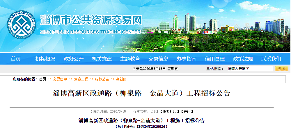 淄博高新區(qū)政通路(柳泉路-金晶大道)工程施工招標公告