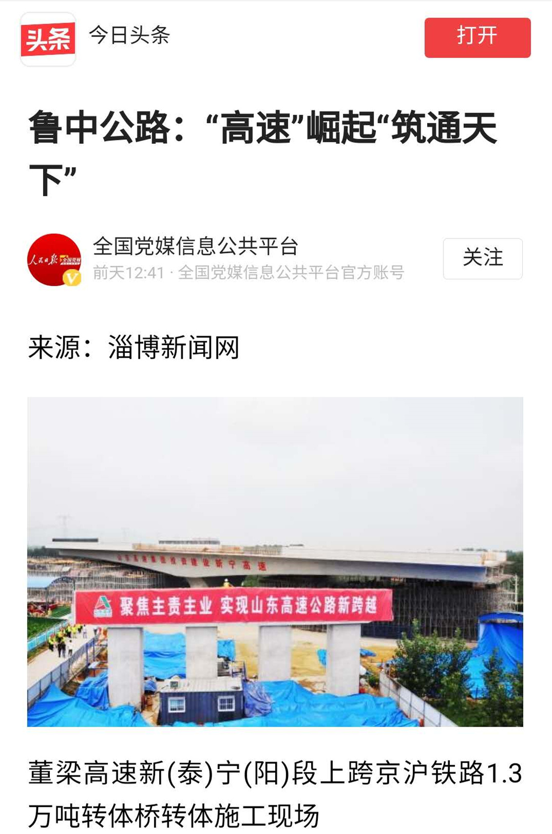 2020年7月30日,《淄博日報》4版刊登了題為《董梁高速新(泰)寧(陽)段上跨京滬鐵路1.3萬噸轉(zhuǎn)體橋成功轉(zhuǎn)身,淄博路企“走出去”再豎里程碑——魯中公路:“高速”崛起“筑通天下”》的文章。