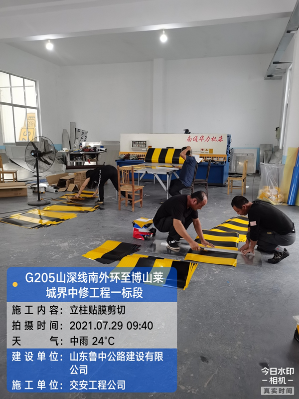 標(biāo)志牌施工分部充分利用因臺(tái)風(fēng)不能現(xiàn)場(chǎng)安裝的空余時(shí)間,在車間內(nèi)加工反光膜及標(biāo)志牌,爭(zhēng)分奪秒與時(shí)間賽跑。
