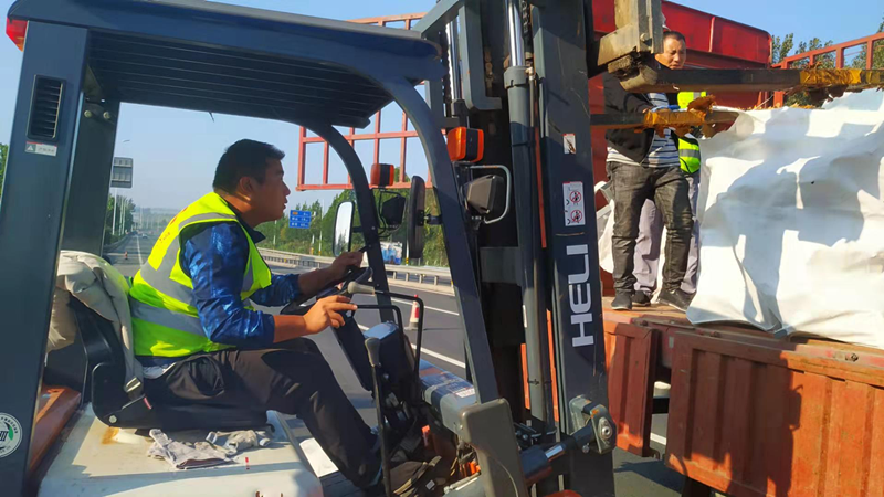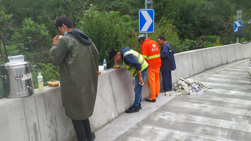 在車流入潮的G205國道旁,在青石關(guān)青山綠水間的蜿蜒公路旁,同事們?cè)诠さ厣舷碛昧酥星锕?jié)的午餐,稍作停留便繼續(xù)開干。