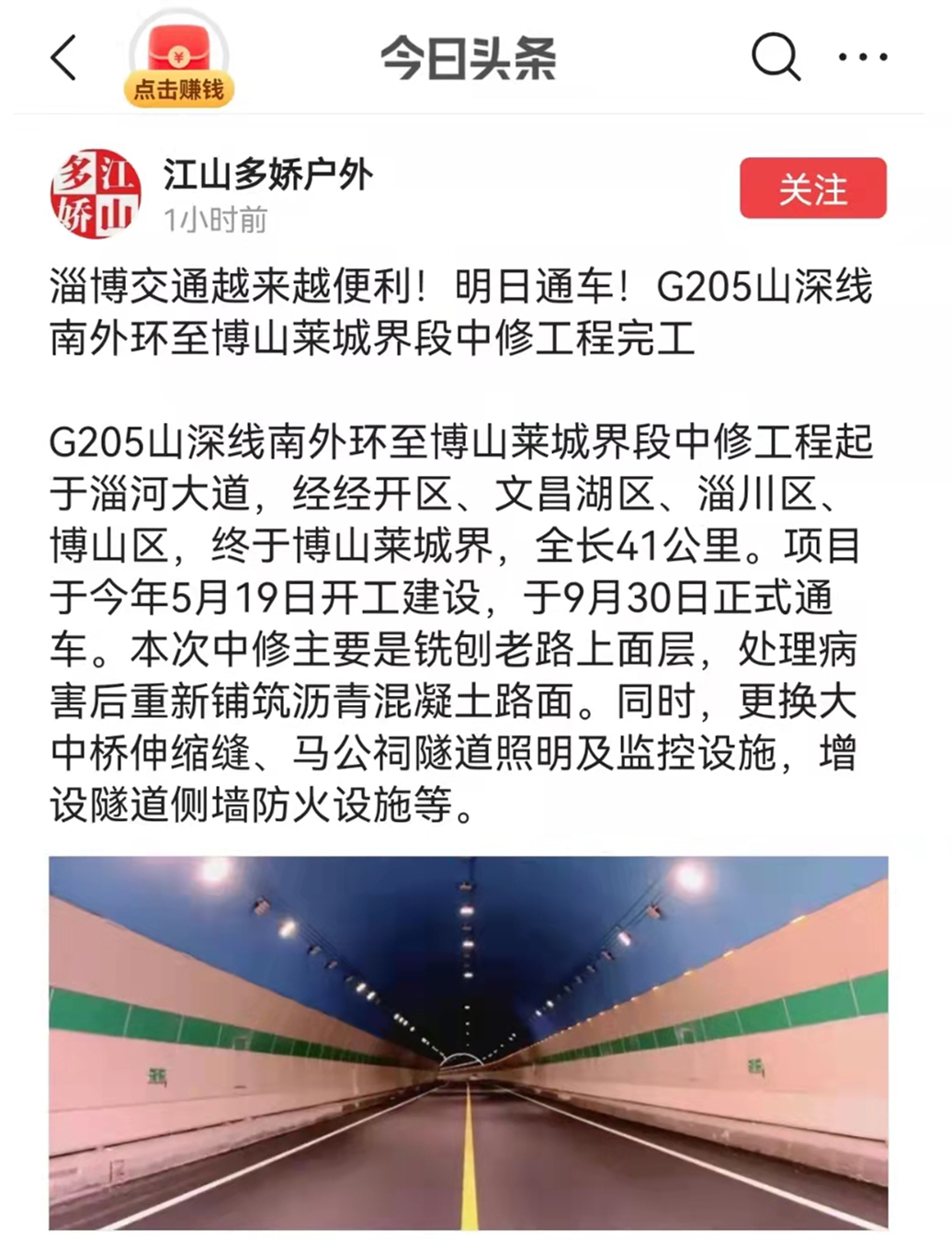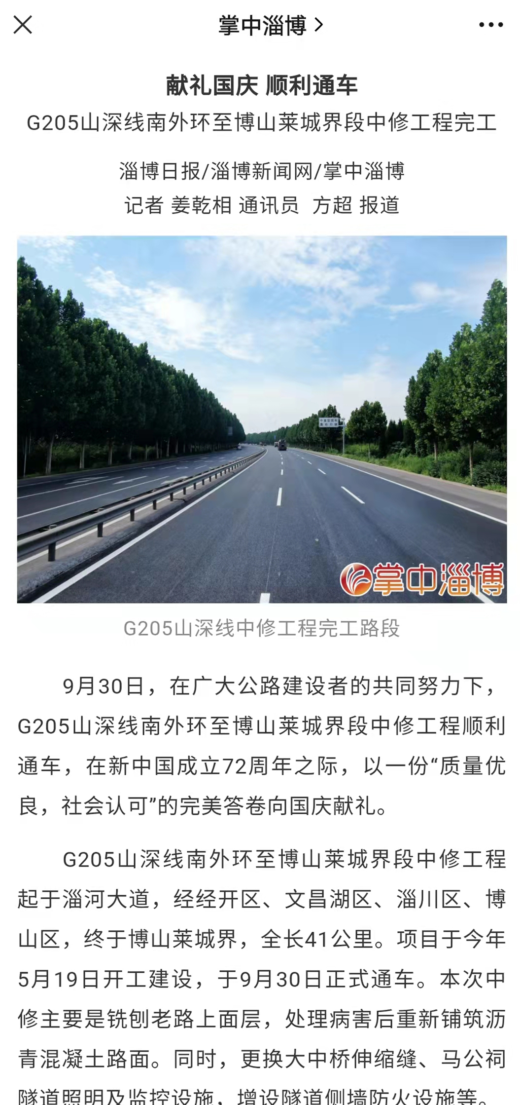 9月29日,就G205驗收并交付使用的消息網(wǎng)易、搜狐、澎湃新聞、今日頭條、淄博日報、淄博交通等各家媒體爭相報道,廣大市民紛紛轉(zhuǎn)發(fā),相互告知,成為國慶節(jié)前夕我市最熱門的新聞話題,也為魯中公路贏來一撥網(wǎng)絡(luò)熱搜。