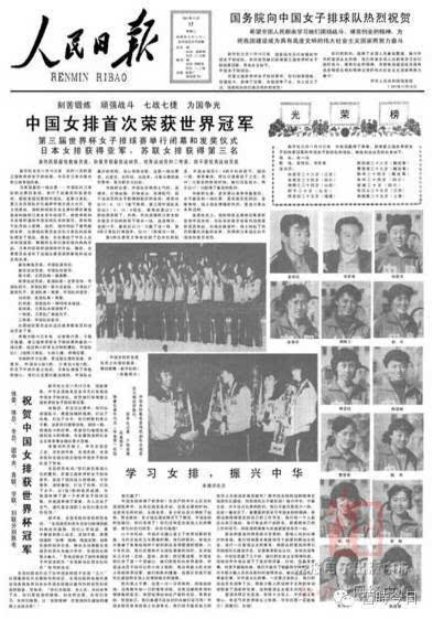 次日《人民日?qǐng)?bào)》頭版:《學(xué)習(xí)女排,振興中華——中國(guó)贏了》,評(píng)論員寫道,“用中國(guó)女排的這種精神去搞現(xiàn)代化建設(shè),何愁現(xiàn)代化不能實(shí)現(xiàn)?”